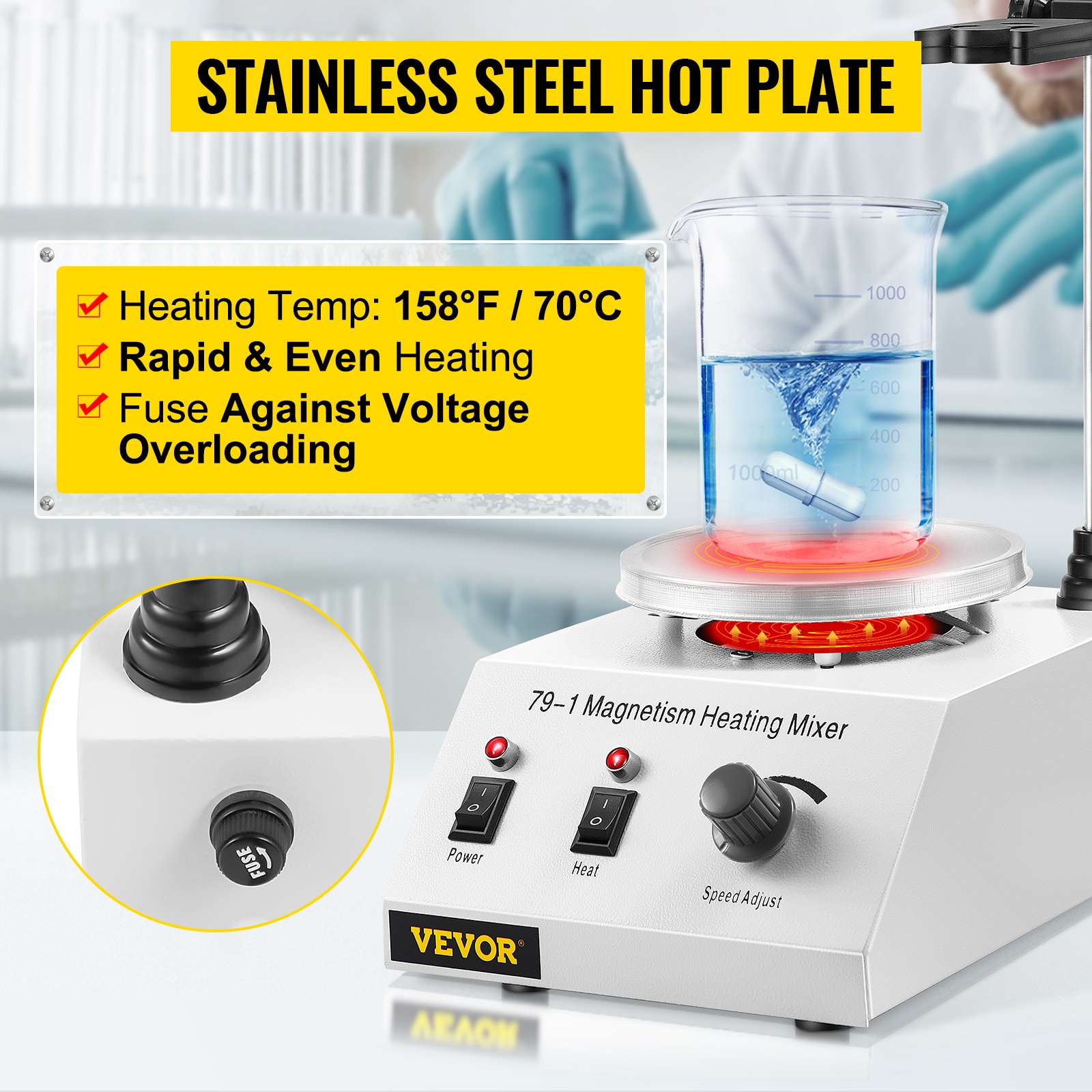 Laite kykenee sekä lämmittämään että sekoittamaan samanaikaisesti, mikä tekee siitä käyttökelpoisen monissa laboratorio- ja prosessisovelluksissa, joissa tarvitaan tasalaatuista ja kontrolloitua sekoitusta.