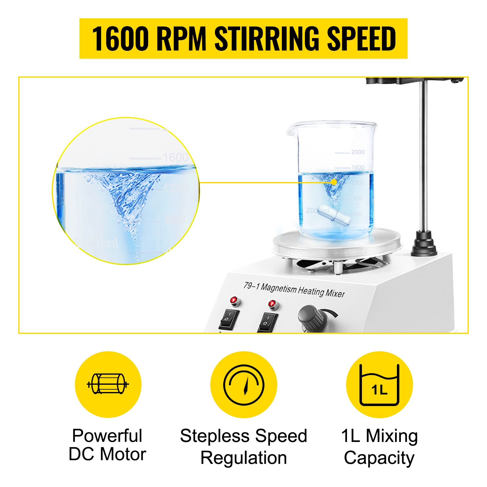 Tehokas tasavirtamoottori mahdollistaa säädettävän sekoitusnopeuden välillä 0–2000 kierrosta/min. Sekoittimen tilavuus on jopa 1000 mL nestettä, mikä riittää moniin laboratorio- ja opetuskäyttöihin.