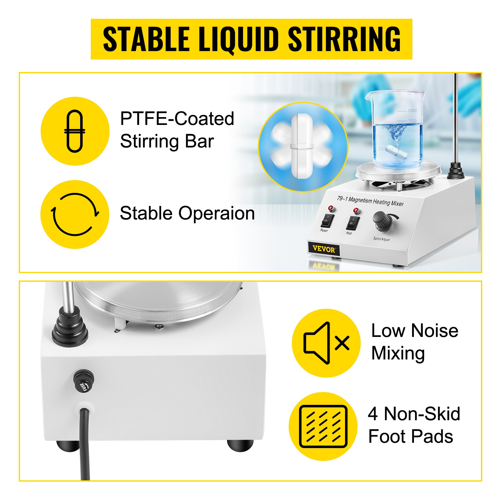 PTFE-pinnoitettu sekoitustanko pyörii vakaasti ja hiljaisesti myös suurilla nopeuksilla eikä reagoi useimpien liuosten kanssa. Neljä liukumista estävää jalkatyynyä pitävät laitteen tukevasti paikallaan työpöydällä.