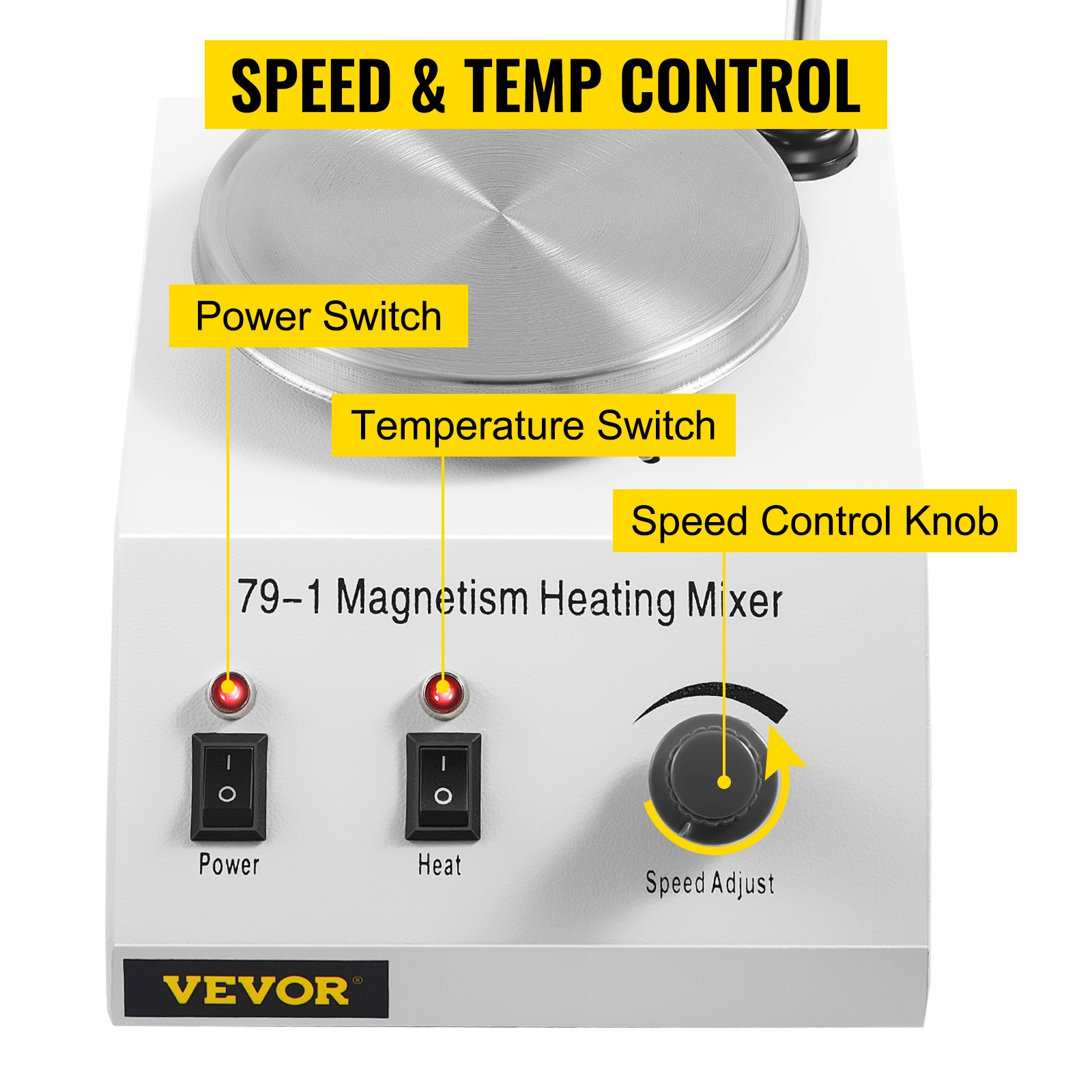 Digitaalinen kuumalevy-magneettisekoittaja on varustettu kahdella säätönupilla, joilla nopeus ja lämpötila voidaan säätää tarkasti kääntämällä nuppia haluttuun asentoon.