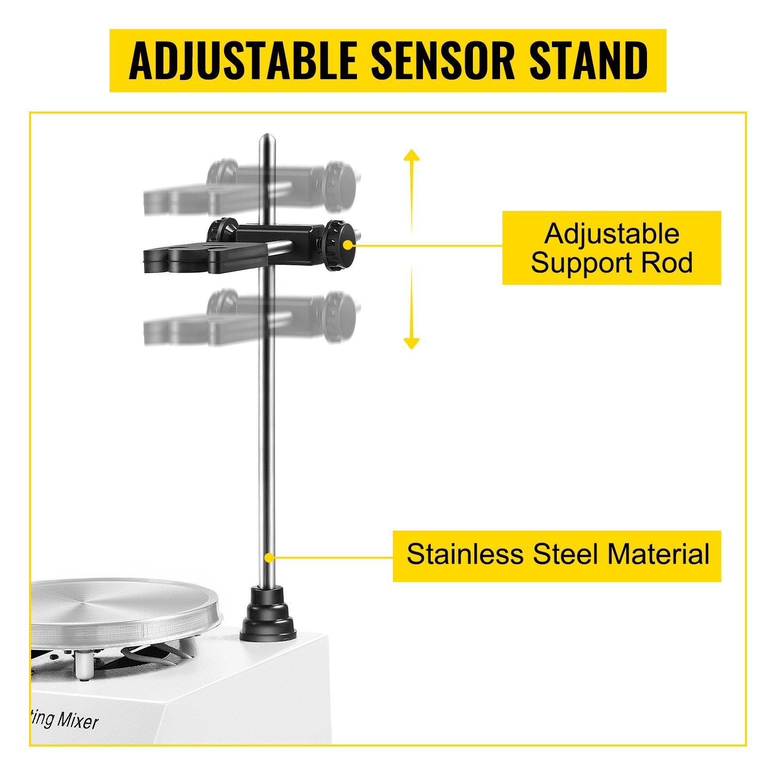 Mukana tuleva teline ja säädettävä pidike mahdollistavat lämpötila-anturin asettamisen haluttuun korkeuteen, jotta lämpötilaa voidaan seurata tarkasti sekoituksen aikana.