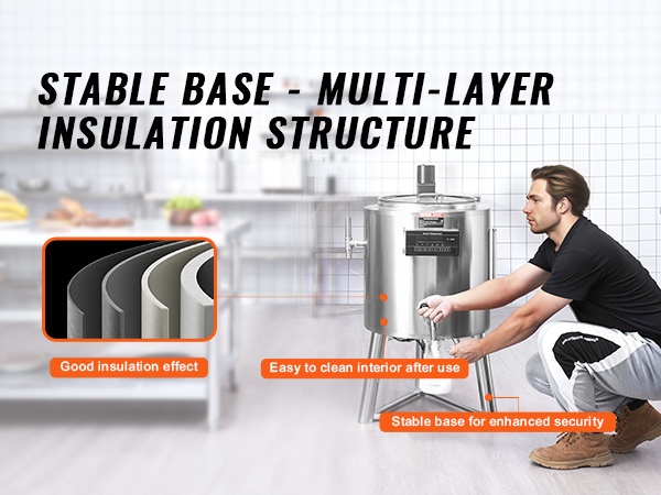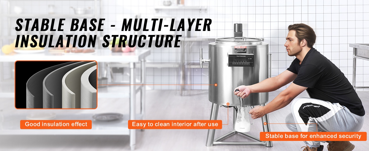 Pastörointikoneen sisäsäiliö on valmistettu elintarvikekäyttöön soveltuvasta 304-ruostumattomasta teräksestä ja ulkokuori kestävästä ruostumattomasta teräksestä. Rakenne on korroosionkestävä, helposti puhdistettava ja suunniteltu pitkää käyttöikää varten.