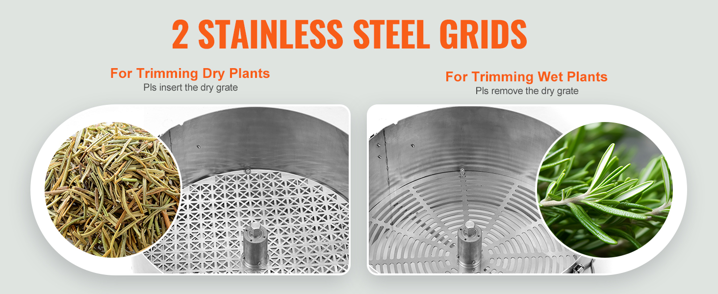 Trimmerin mukana tulee 2 erilaista leikkausritilää tehokkaaseen työskentelyyn. Märkäleikkuuta varten kuivan leikkauksen ritilä poistetaan, kun taas kuiville kasvinlehdille käytetään kuivaleikkuuritilää jauhamiseen ja trimmaukseen.