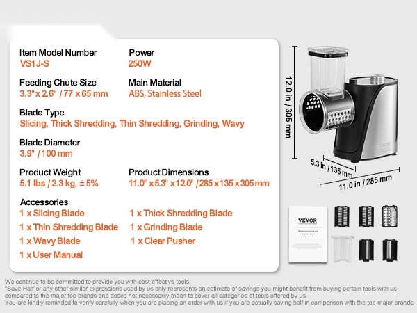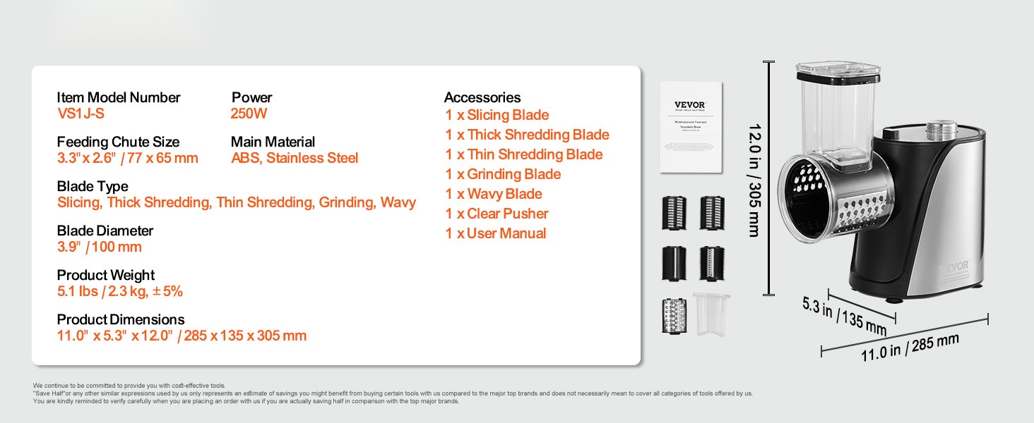 - Säädettävä viipaleen paksuus: 0"–0.5" / 0–12 mm