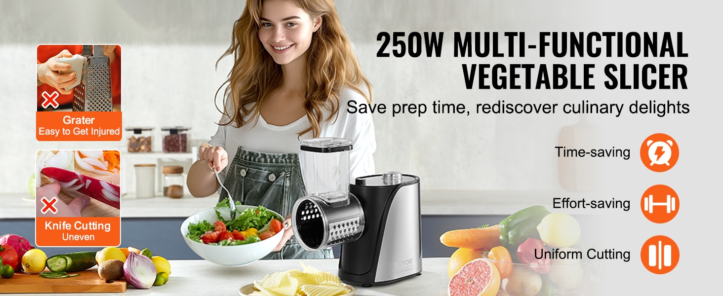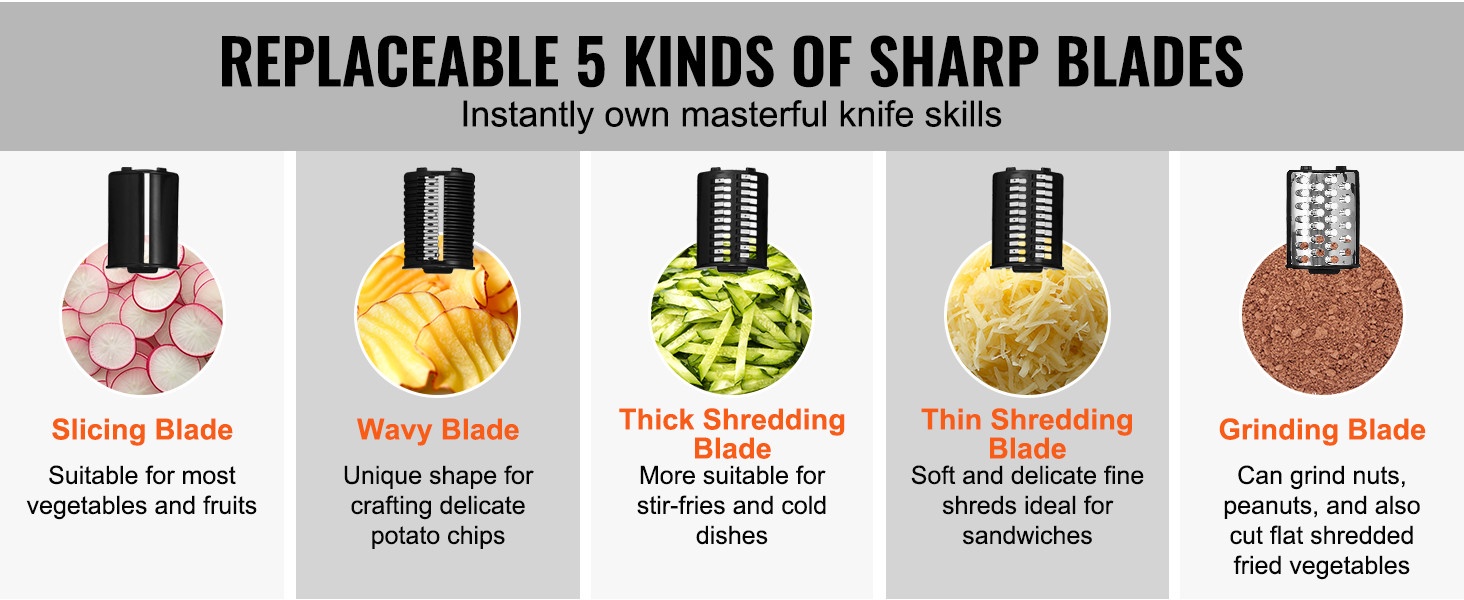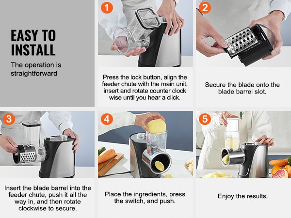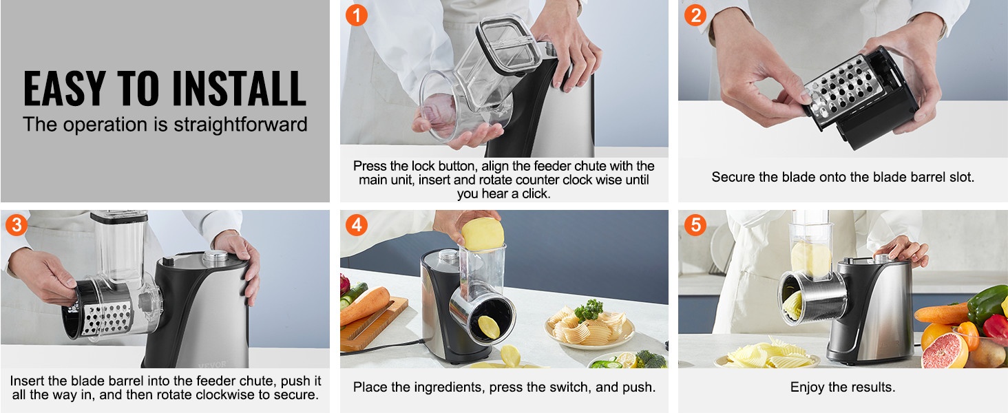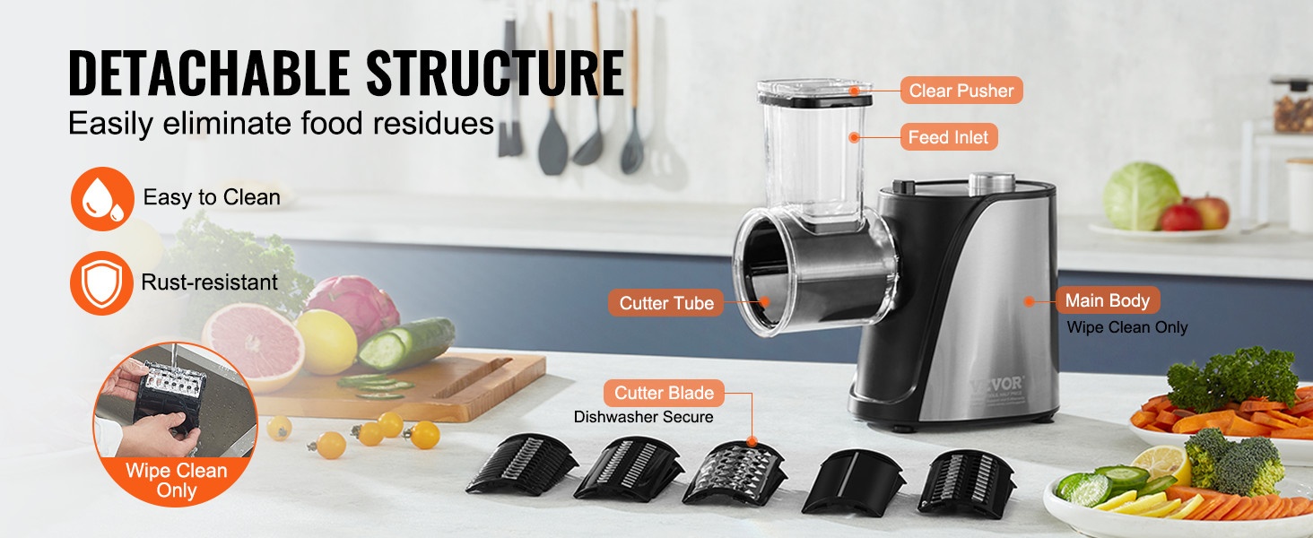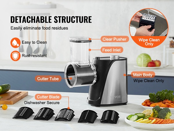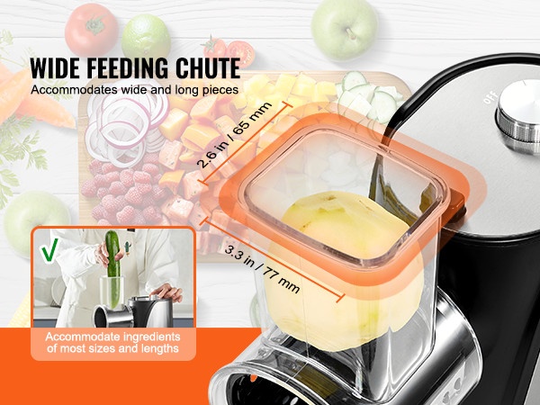 Suurikokoinen syöttökaukalo vähentää esivalmistelua: tavalliset hedelmät ja vihannekset voi viipaloida ilman useita pilkkomiskertoja, ja useita raaka-aineita voi asettaa sisään yhtä aikaa. Jousitoiminen työntäjä syöttää ainekset tasaisesti, ja pehmeä jousi auttaa estämään pehmeiden tuotteiden, kuten tomaattien ja kiivien, litistymisen.