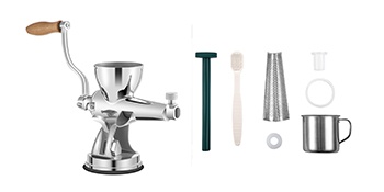 Ergonomisen muotoilun ja voimaa säästävän vipumekanismin ansiosta kampea on miellyttävä pyörittää. Kammen voi irrottaa, ja se kääntyy 360 astetta. Kestävä ruuvipuristin ja tiheäverkkoisen suodattimen yhdistelmä tehostaa puristusta ja auttaa säilyttämään aitoja makuja.