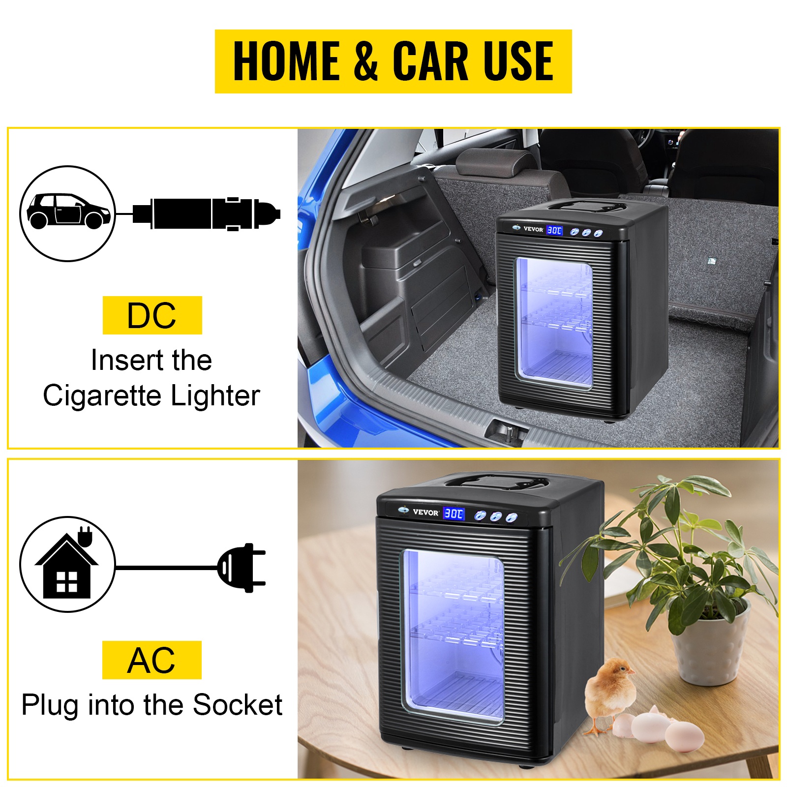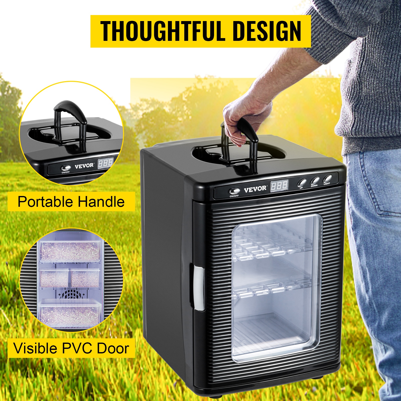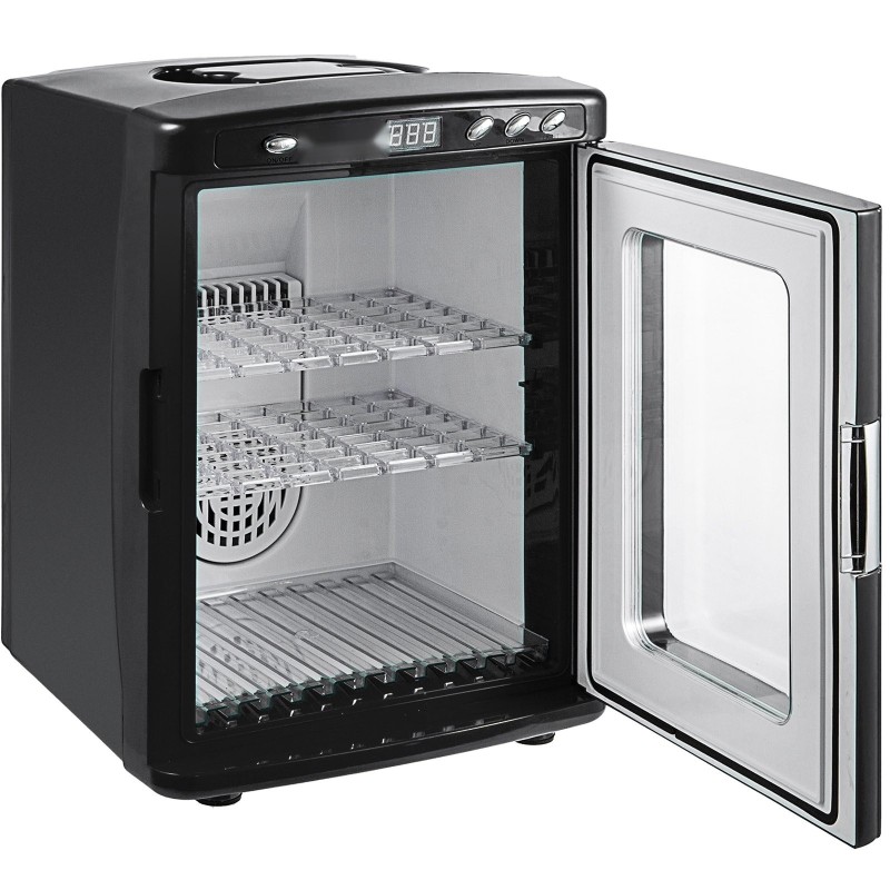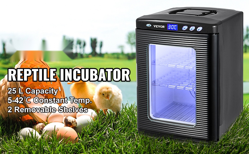 Tämä termostaattinen haudontalaite toimii sekä jäähdyttimenä että lämmittimenä termoelektrisen järjestelmän avulla. Sisätilavuus on 25 L, ja se sopii jopa 2 L pulloille ja pulloille. Mukana on kaksi irrotettavaa hyllyä. Laitteessa on tarkka lämpötilan valvonta, ja sisälämpötila näkyy LED-näytöllä. Matelijoiden munien haudonnan ja kuljetuksen lisäksi laitetta voidaan käyttää myös pienenä jääkaappina ruoalle tai juomille.