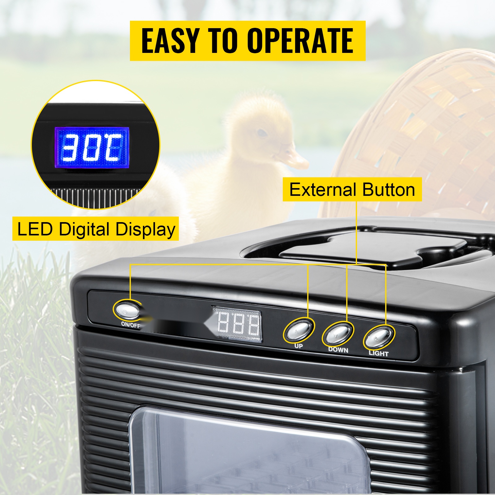 Muna-inkubaattorissa on läpinäkyvä PVC-ovi, jonka kautta sisältöä on helppo tarkkailla. Sisäänrakennettu kantokahva ja noin 13 lbs paino tekevät laitteesta helposti siirrettävän.