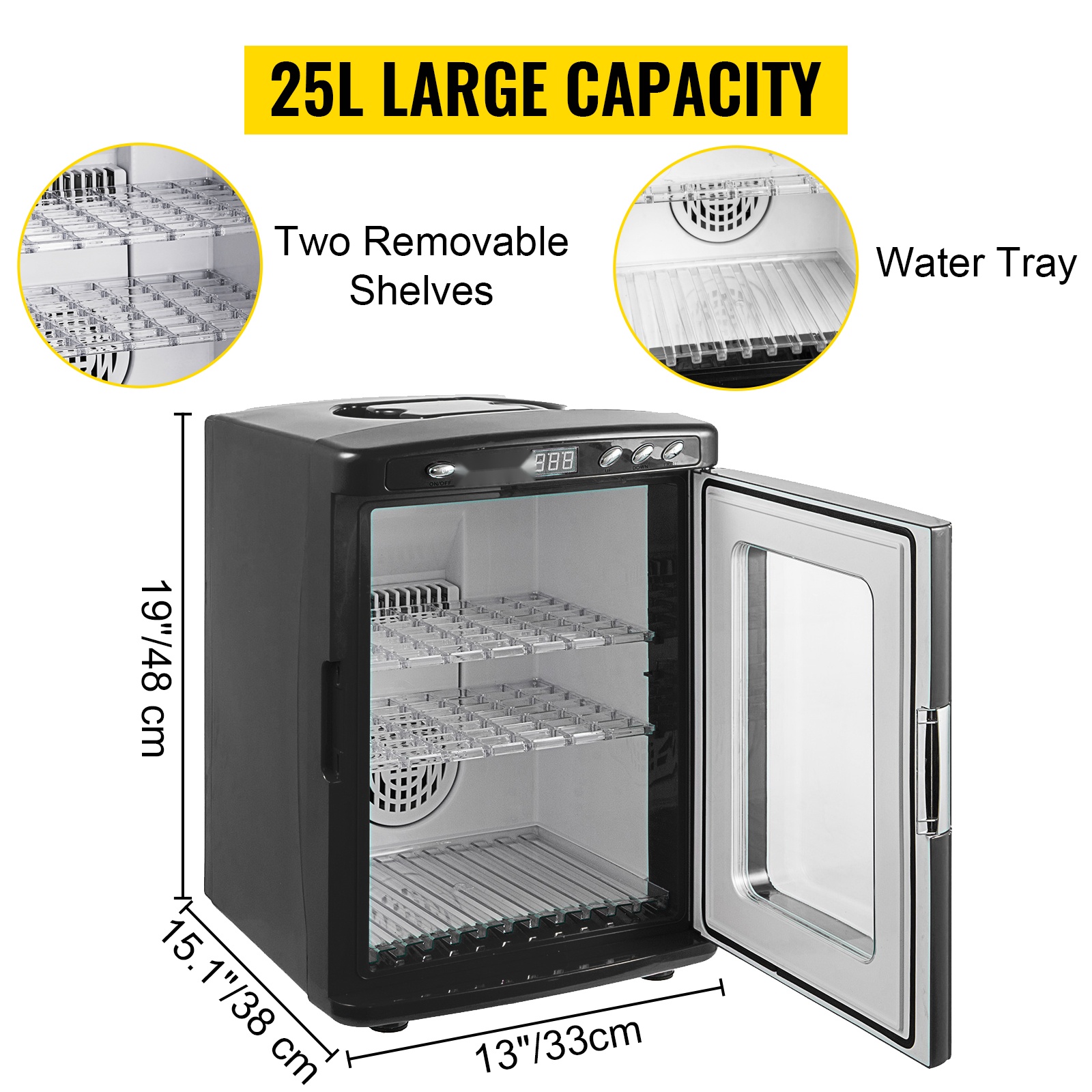 Tieteellinen laboratorioinkubaattori tarjoaa 25 L tilavuuden. Mukana on kaksi irrotettavaa hyllyä säilytyksen helpottamiseksi sekä vesiallas kosteuden ylläpitoon.
