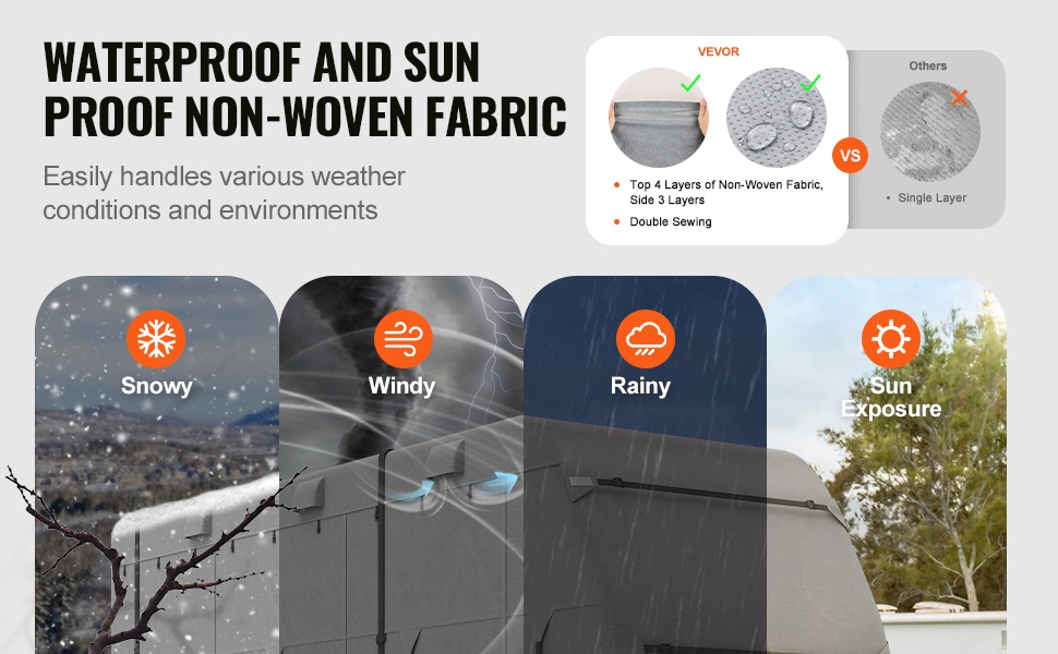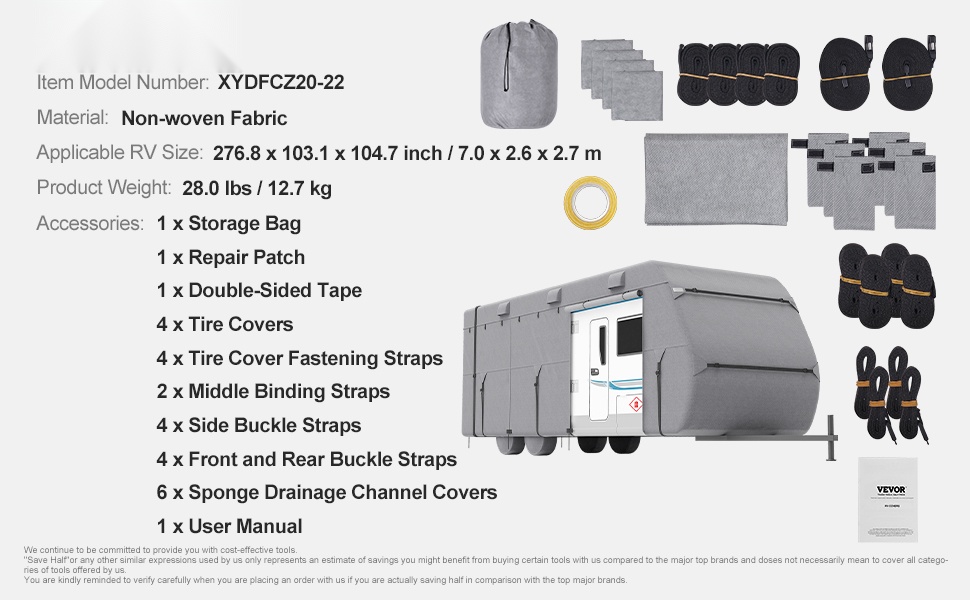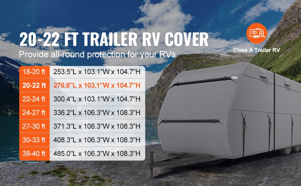 Tämä matkailuauton suojapeite on suunniteltu Class A -matkailuautoille, joiden pituus on 20'–22'. Oikean istuvuuden varmistamiseksi mittaa ajoneuvosi huolellisesti ennen asennusta. Peite istuu tiiviisti ajoneuvon ympärille ja auttaa suojaamaan sitä sateelta, auringolta, tuulelta ja lialta.