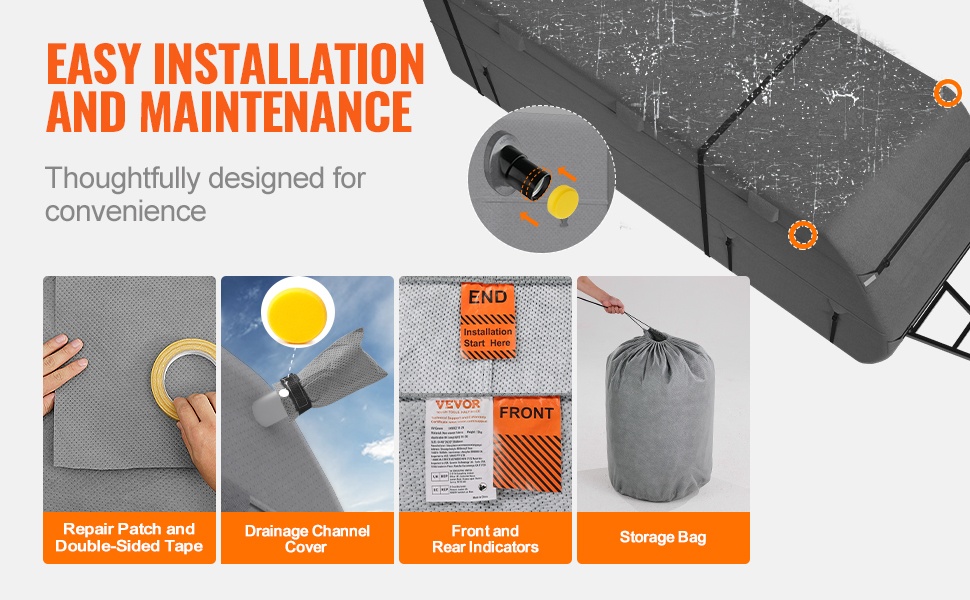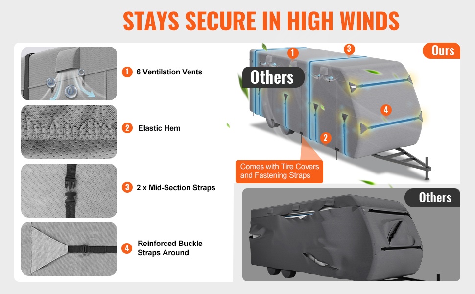 Peitteessä on 6 tuuletusaukkoa, jotka päästävät ilman kiertämään ja vapauttavat kovaa ilmavirtaa. Ympärikiertävä solki- ja hihnajärjestelmä auttaa säilyttämään muodon ja estää peitettä pullistumasta voimakkaassa tuulessa sekä vähentää repeämisen tai irtoamisen riskiä.