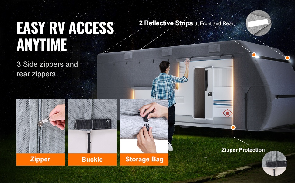 Sivu- ja takavetoketjuovet tekevät pääsystä matkailuautoon helpompaa ilman, että koko peitettä tarvitsee poistaa. Vetoketjujen alaosat on vahvistettu leveämmällä tarrakiinnityksellä, joka lisää kestävyyttä. Etu- ja takaosassa olevat heijastinnauhat parantavat näkyvyyttä hämärässä ja lumisissa olosuhteissa.