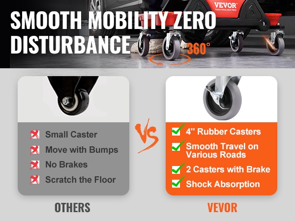 - Sujuva liikkuminen 4-tuumaisilla kumipyörillä ja 360° kääntymisellä
