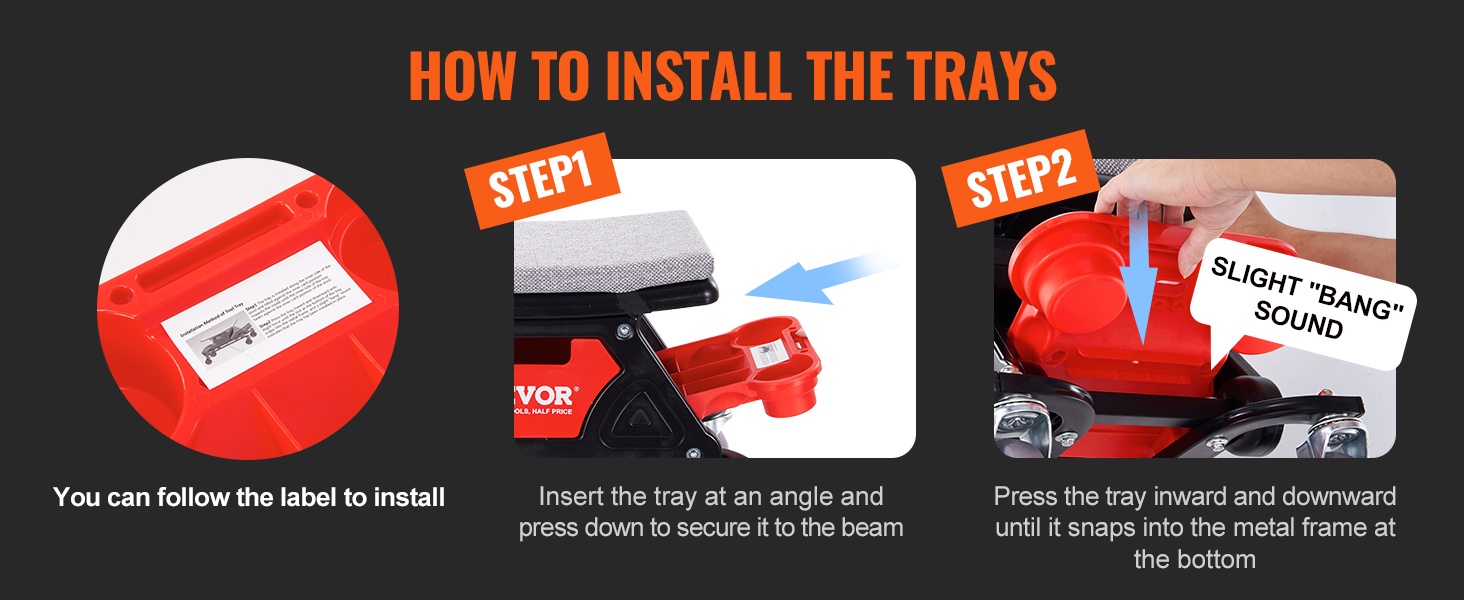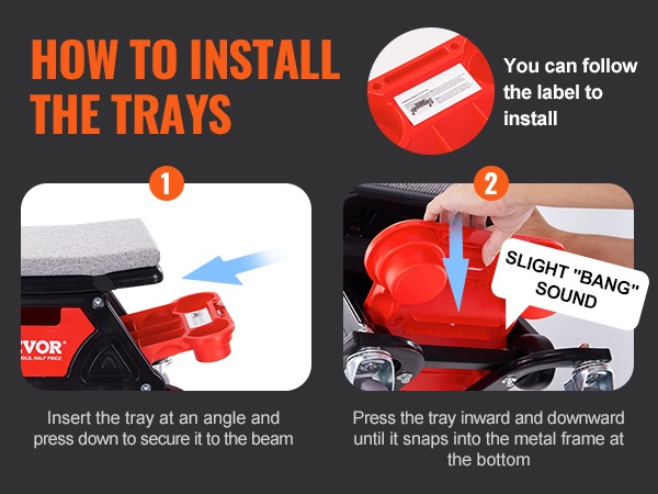 Voit asentaa työkalulokerot seuraamalla rungossa olevaa merkintää. Työnnä lokero ensin vinossa kulmassa, paina sitten alas kiinnittääksesi sen palkkiin. Paina lokeroa sisään- ja alaspäin, kunnes se napsahtaa kiinni alaosan metallikehykseen.