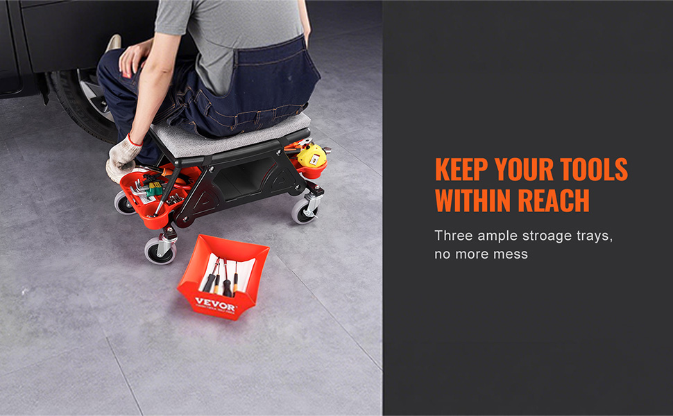 Mekaanikon jakkara teräsrunko 360 asteen kääntyvä istuin pyörillä integroidulla työkalutarjottimella