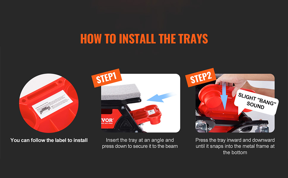 Voit asentaa työkalulokerot seuraamalla rungossa olevaa merkintää. Työnnä lokero ensin vinossa kulmassa, paina sitten alas kiinnittääksesi sen palkkiin. Paina lokeroa sisään- ja alaspäin, kunnes se napsahtaa kiinni alaosan metallikehykseen.