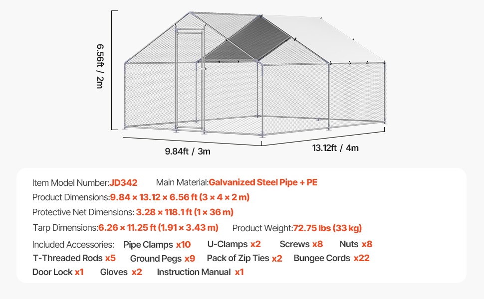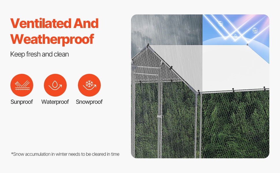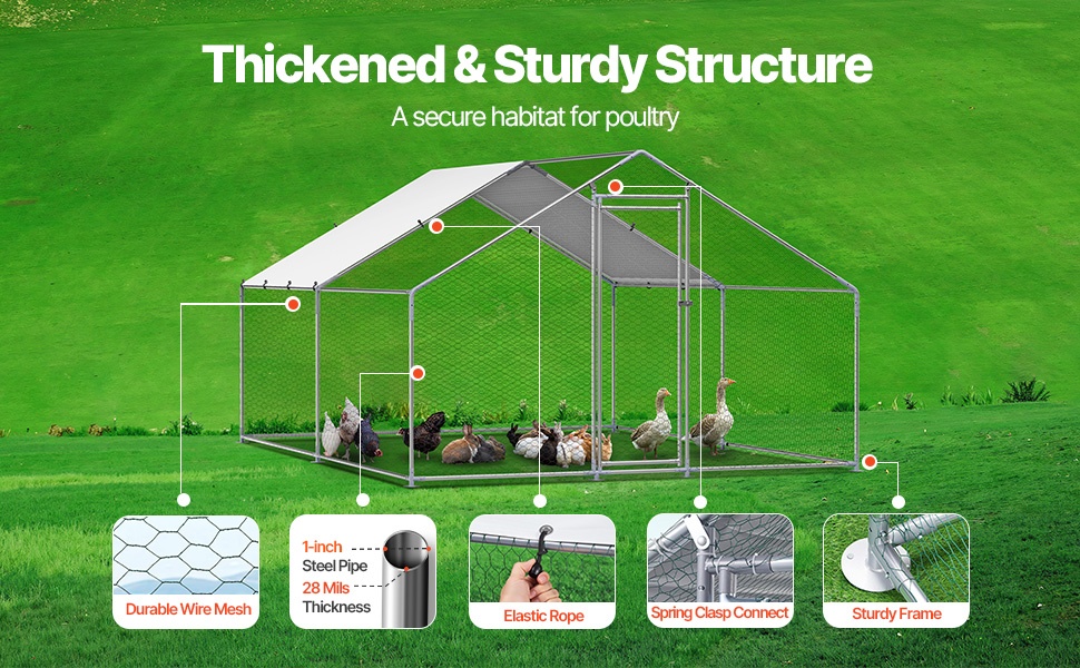 Aidan runko on valmistettu 1" paksuista galvanoiduista teräsputkista, jotka tarjoavat tukevan ja kestävän rakenteen. Kuusikulmainen suojaverkko auttaa pitämään siipikarjan aitauksen sisällä ja suojaa ulkopuolisilta uhkilta. Neljältä sivulta avoin rakenne varmistaa hyvän ilmanvaihdon ja auttaa pitämään hajut kurissa.