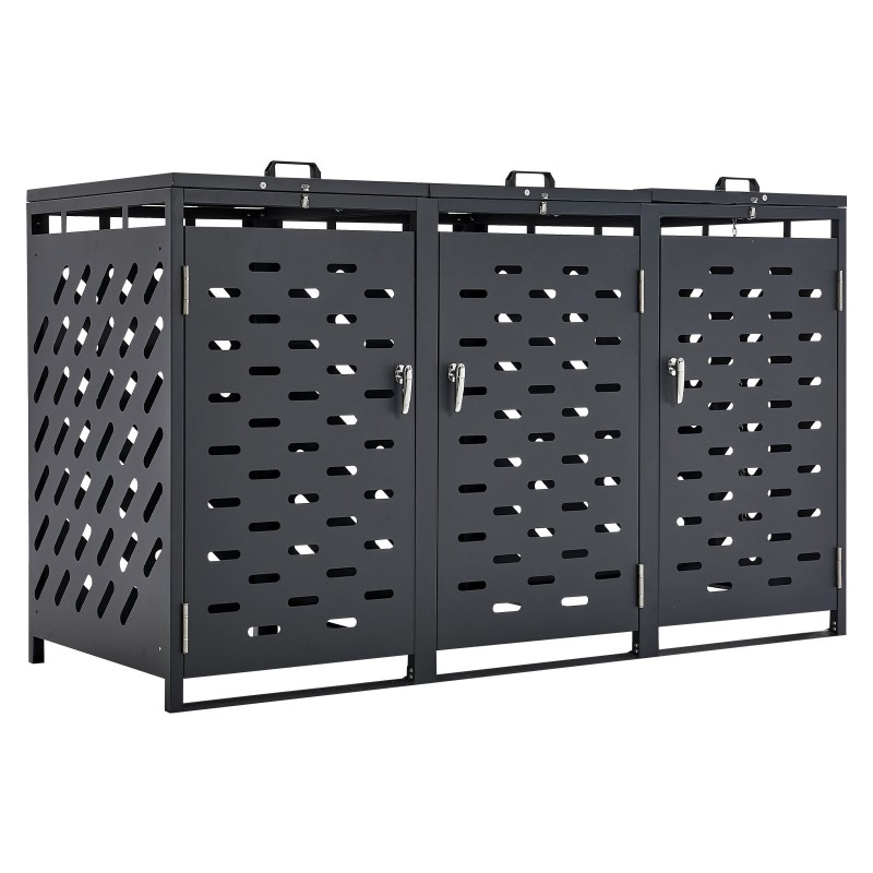 Tämä metallinen roska-astioiden säilytyskaappi tarjoaa siistin ja suojatun paikan jopa 3 x 52.79 gallonan / 240 L jäteastialle. Galvanoidusta teräksestä valmistettu ja pulverimaalattu kaappi kestää säätä, suojaa jäteastioita eläimiltä ja auttaa pitämään pihan, terassin tai puutarhan siistinä.
