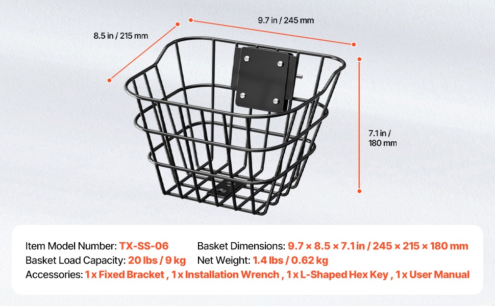 Tämä tyylikäs takakori täydentää polkupyöräsi ulkonäköä ja lisää käytännöllistä säilytystilaa. Kori kestää jopa 50 lbs (22 kg) kuorman, joten se sopii hyvin esimerkiksi ruokaostoksille, lemmikin kuljettamiseen tai matkatavaroille. Kori on valmistettu kestävästä metallista ja siinä on ruostetta hylkivä pinnoite, joten se soveltuu hyvin päivittäiseen käyttöön ja on helppo pitää puhtaana.