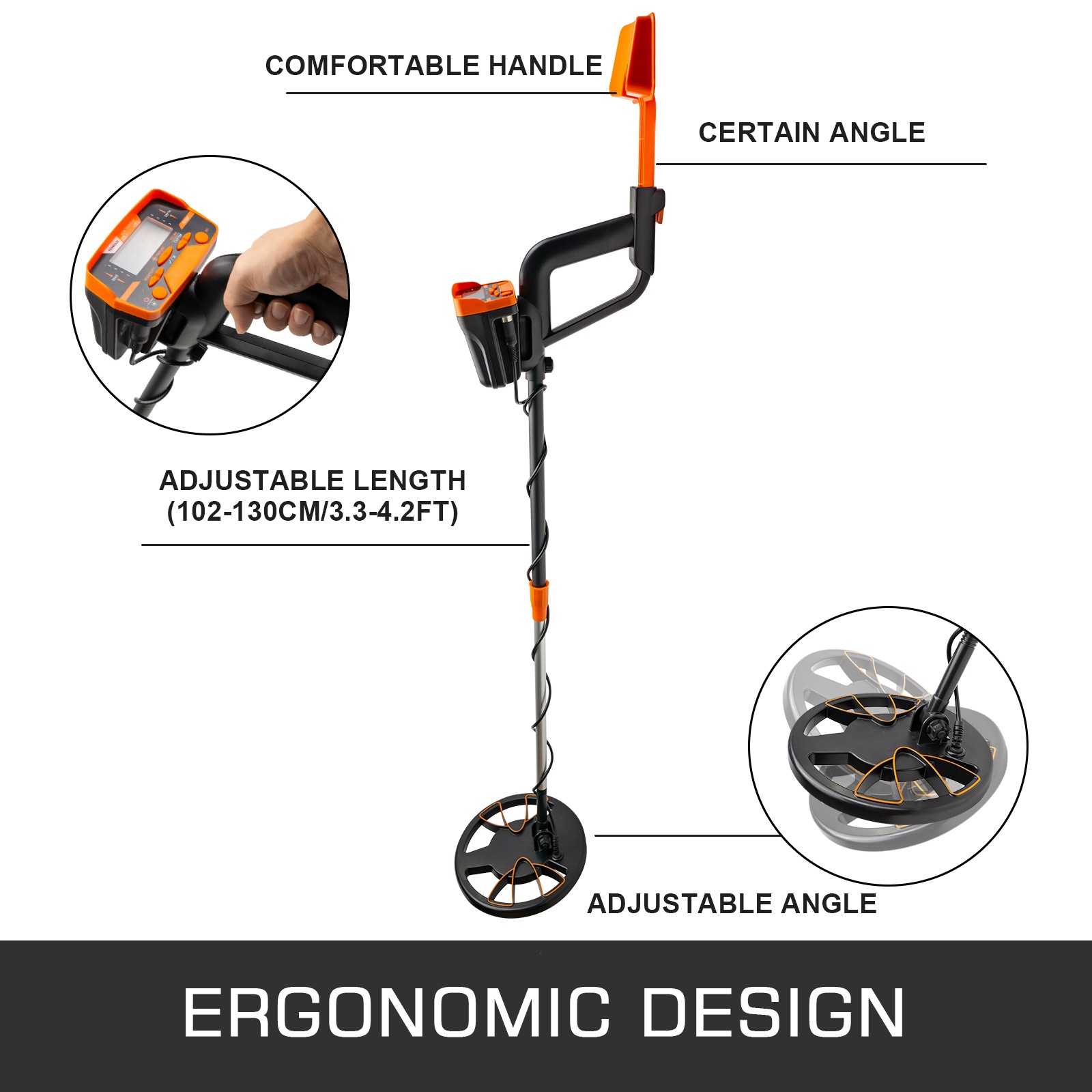 Metallinilmaisimessa on käsitukeen perustuva rakenne ja mukava kahva. Säädettävä varsi 102-130 cm / 3.3-4.2 jalkaa sopii eri pituisille käyttäjille, sekä aikuisille että vanhemmille lapsille.
