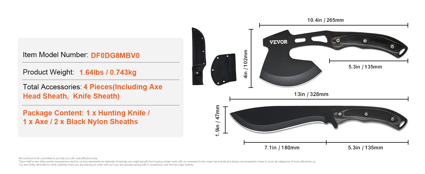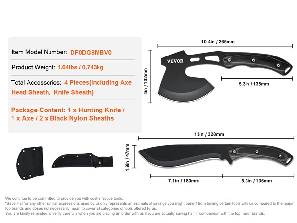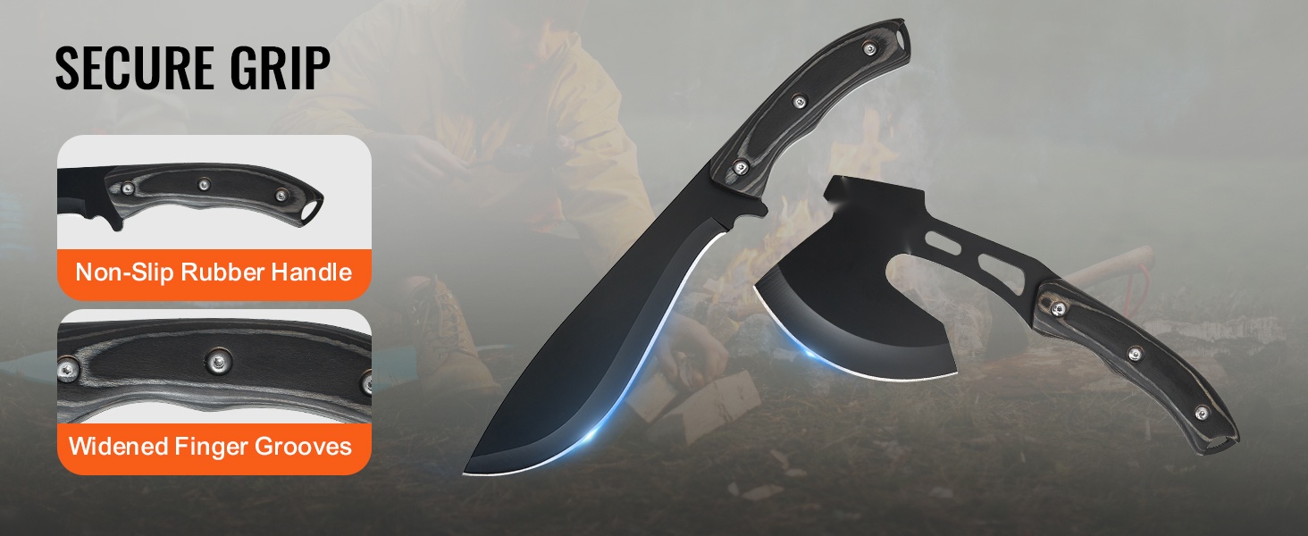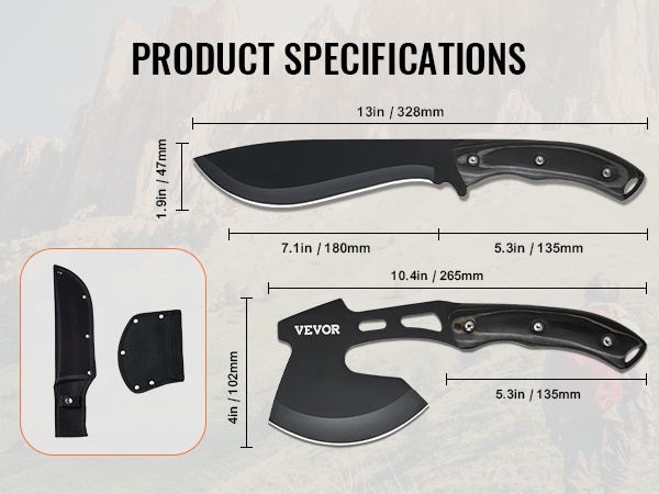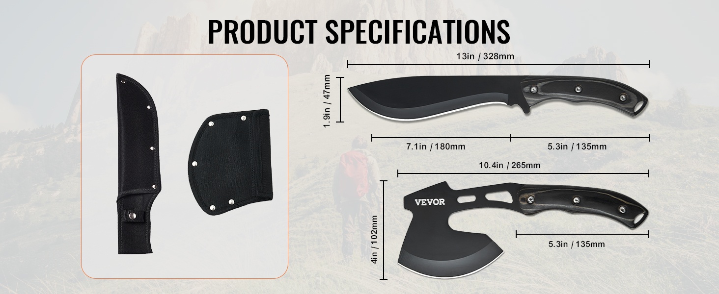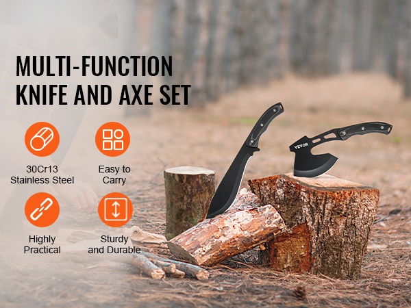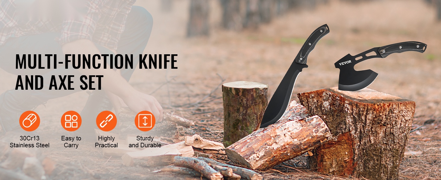 Tämä kestävä ja käytännöllinen leiri- ja selviytymisvälinesetti on suunniteltu ulkoilmaihmisille retkeilyyn, eräilyyn ja selviytymistilanteisiin. Setti sisältää veitsen ja kirveen sekä niille tarkoitetut tuppisuojat turvallista kuljetusta ja säilytystä varten.