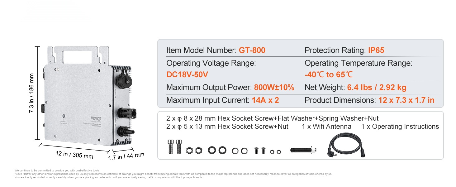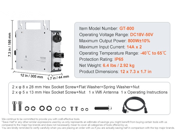 - Maksimi lähtöteho: 800W±10% kompaktissa mikroinvertterissä