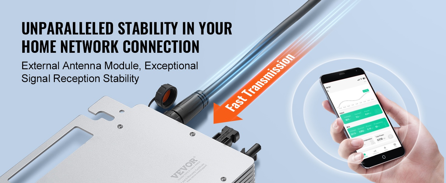Ulkoinen antennimoduuli parantaa signaalin voimakkuutta ja häiriönsietoa, jotta yhteys pysyy tasaisena. Voit tarkistaa invertterin tilan ja tuotannon älypuhelinsovelluksella reaaliaikaisesti, missä ikinä oletkin.