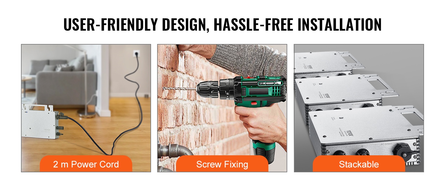 Virtakaapelin pituus on 2 m ja runkoon integroitu koukkurakenne helpottaa seinä- tai telineasennusta. Useita inverttereitä voi kytkeä rinnakkain, joten järjestelmän kapasiteettia on helppo kasvattaa tarpeen mukaan.
