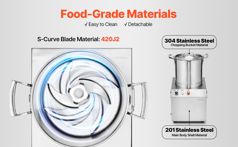Laite on valmistettu kokonaan ruostumattomasta teräksestä. Kulho on elintarvikelaatuista 304-ruostumatonta terästä ja rungon kuori 201-ruostumatonta terästä. Irrotettavat terät ja kulho voidaan pestä helposti, mikä auttaa ylläpitämään hyvää hygieniatason.