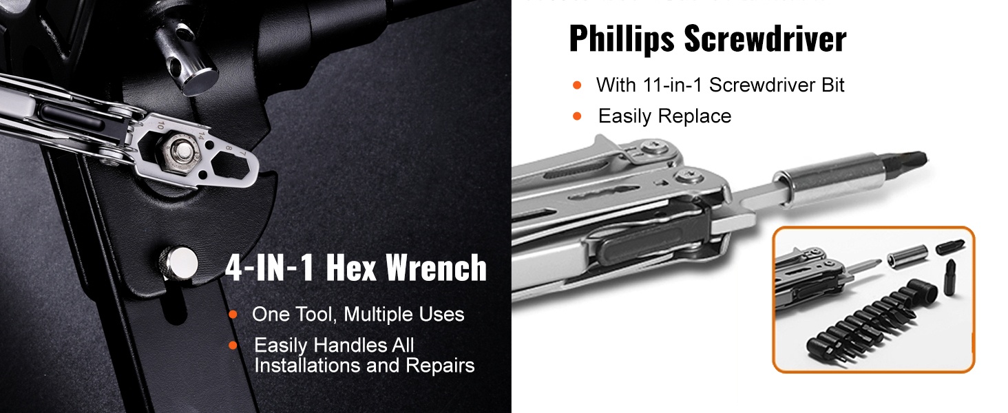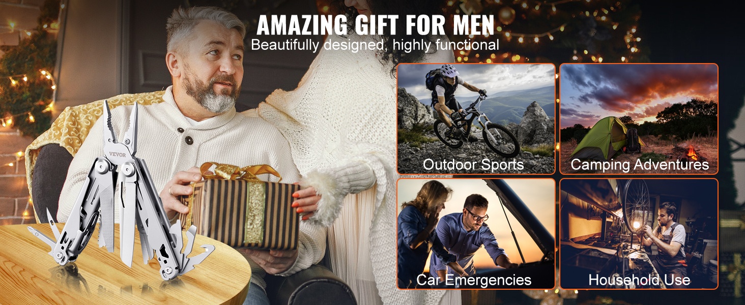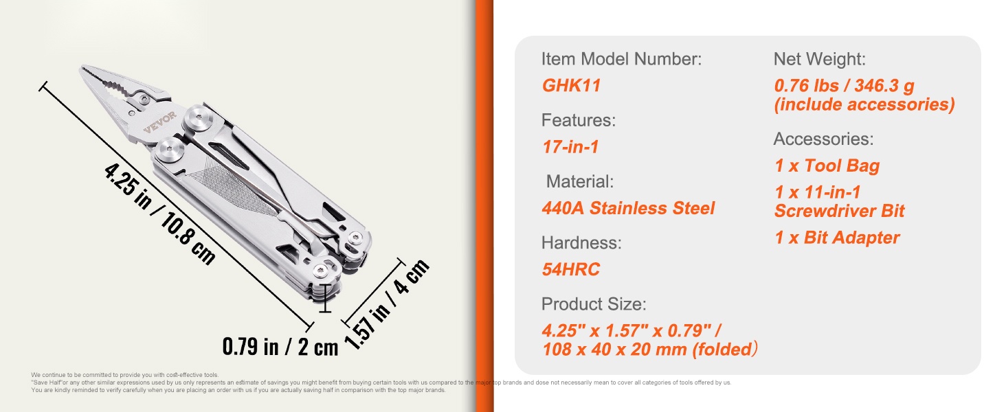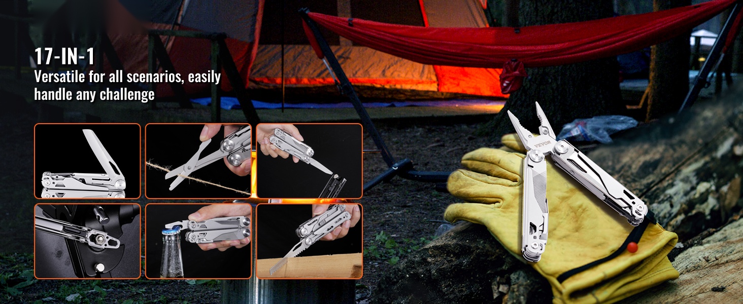 Tämä monitoimityökalu yhdistää useita käytännöllisiä työkaluja, kuten pihdit, pääterän, sakset, viivaimen, puusahaterän, uraruuvimeisselit ja paljon muuta. Yhdet 16-in-1-monitoimipihdit vastaavat kokonaisuutta hyödyllisiä työkaluja, joista on apua sekä ulkoilu- ja eräretkillä että kodin pienissä korjauksissa.