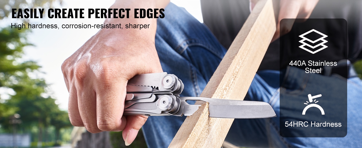 Monitoimityökalu on valmistettu 440A-ruostumattomasta teräksestä, jolla on korkea lujuus ja kovuus. Ammattimainen lämpökäsittely ja huolellinen teroitusprosessi pitävät terän terävänä ja tarjoavat erinomaisen leikkuusuorituksen.