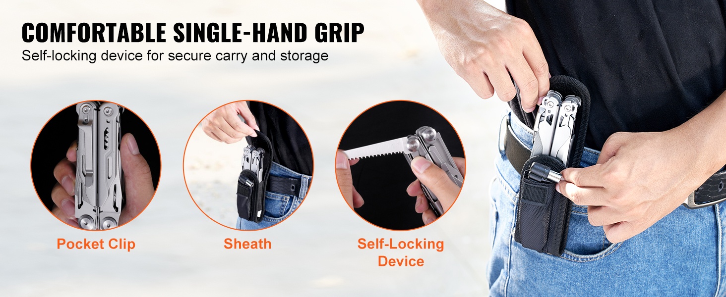 Monitoimipihdeissä on taskuklipsi ja kotelo, jotka helpottavat kuljettamista ja säilytystä. Automaattinen lukitustoiminto lisää turvallisuutta estämällä työkalujen tahattoman avautumisen tai sulkeutumisen käytön aikana.
