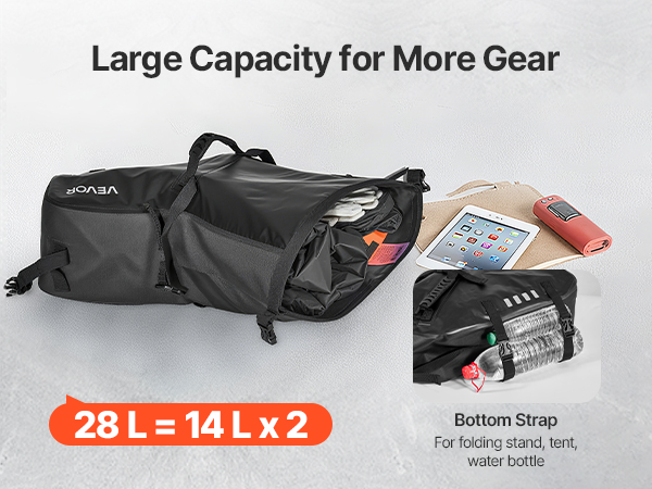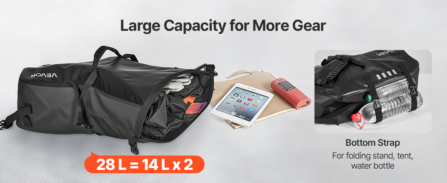 - Kokonaiskapasiteetti: 28 L (14 L x 2) – sopii vaatteille, työkaluille, ruoalle ja päivittäistavaroille