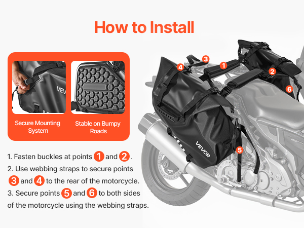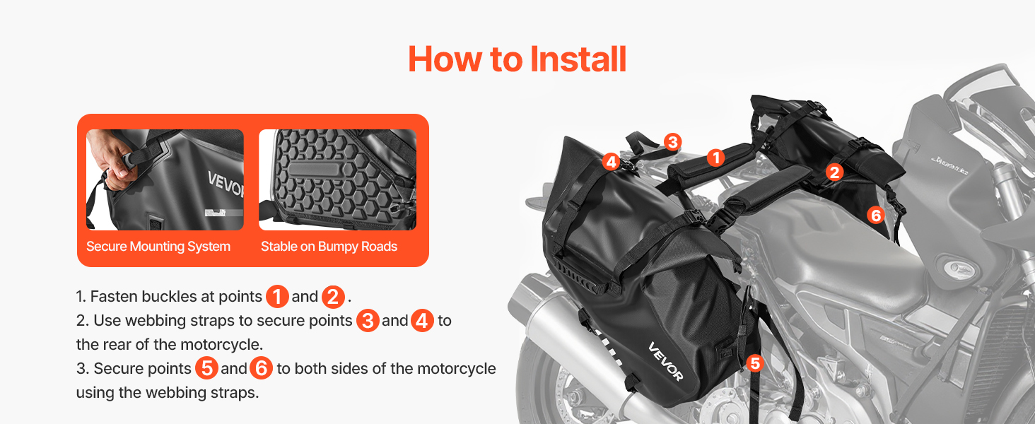 Laukku on nopea asentaa, ja tukevat, säädettävät soljet varmistavat tiukan istuvuuden. Kiinnitys pysyy paikoillaan myös pidemmillä ajomatkoilla ja epätasaisilla teillä.