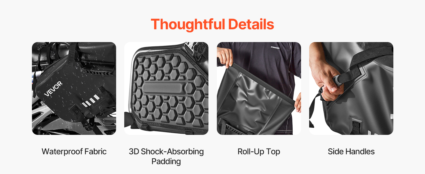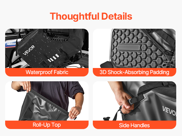 Vesitiivis rakenne suojaa sisältöä sateelta ja roiskeilta. 3D-hunajakennotoppaus ja kahdet sivukahvat tekevät laukusta miellyttävän käsitellä ja vähentävät tärinän vaikutusta ajon aikana.