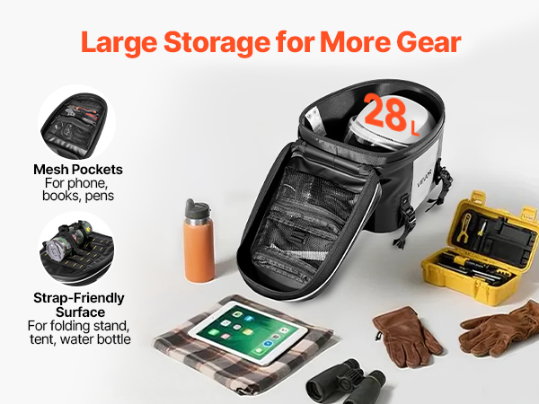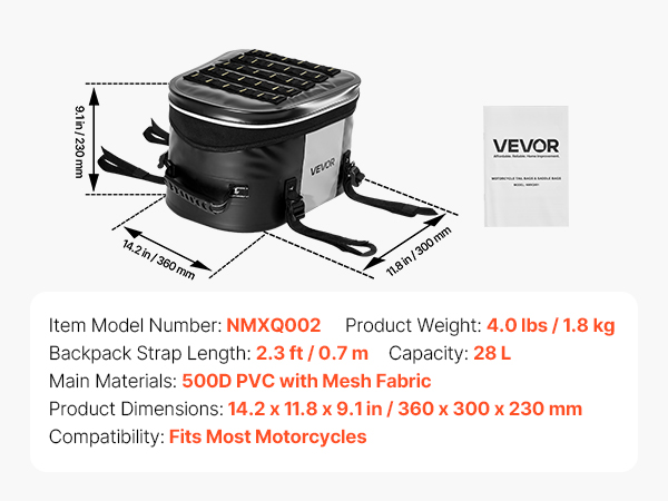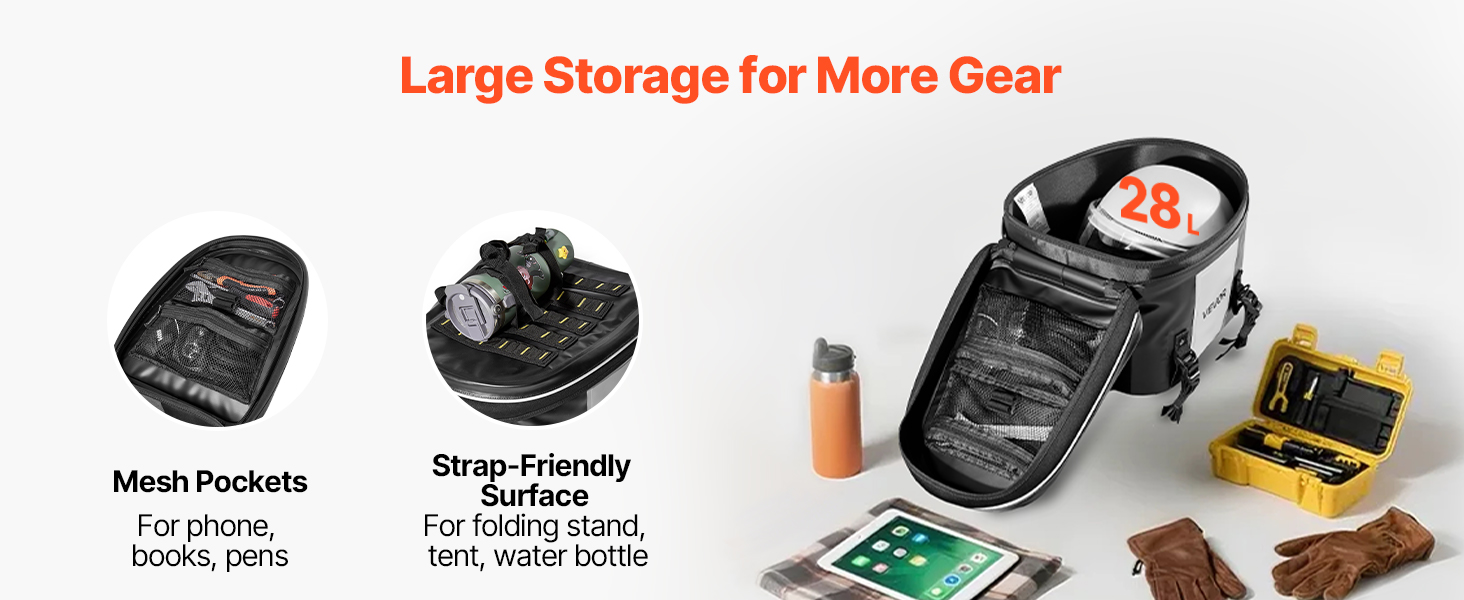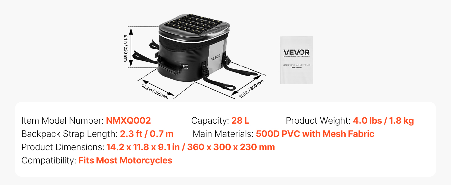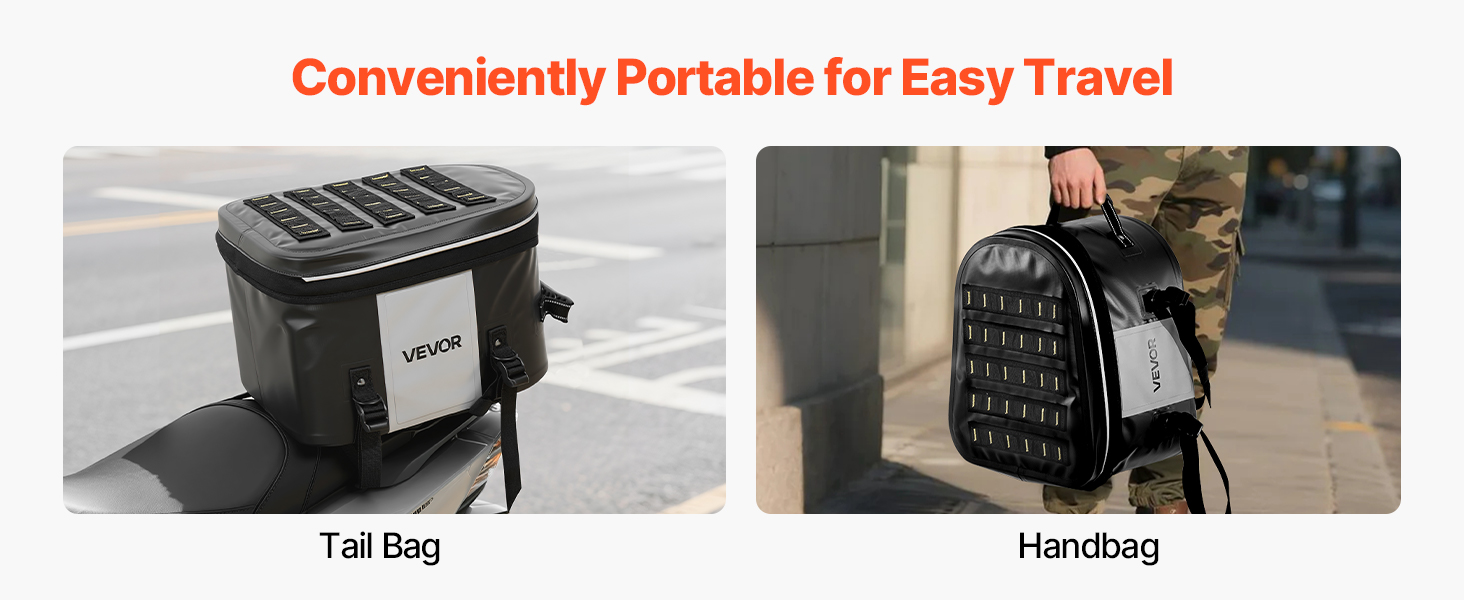 Monikäyttöinen 28 L moottoripyörän takalaukku tarjoaa lisäsäilytystilaa takapenkin tai takatelineen päälle. Laukku suojaa varusteita säältä, pitää tavarat järjestyksessä ja sopii useimpiin moottoripyöriin.