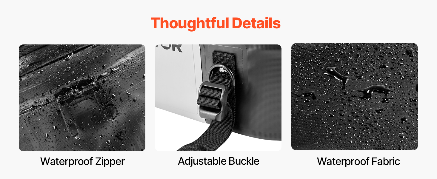 Laukun päämateriaali on 500 D PVC ja verkkokangas, ja siinä on vedenpitävä vetoketju, mikä suojaa sisällön kosteudelta.