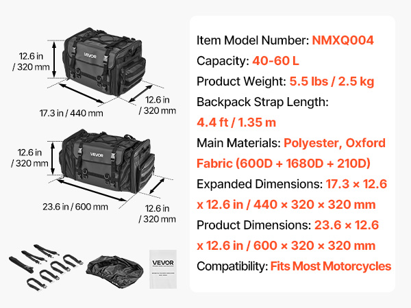 Tämä laajennettava moottoripyörän takalaukku on suunniteltu takapenkin tai takatelineen päälle, ja se sopii useimpiin moottoripyörämalleihin. Laukku tarjoaa lisäsäilytystilaa lyhyille ja pidemmille matkoille ja pitää varusteet suojassa ja helposti saatavilla.