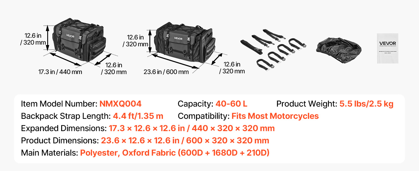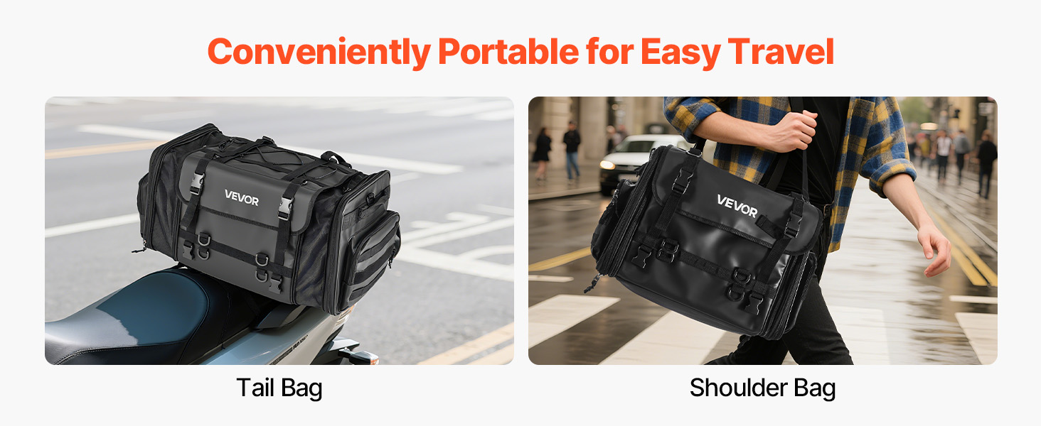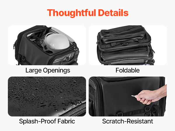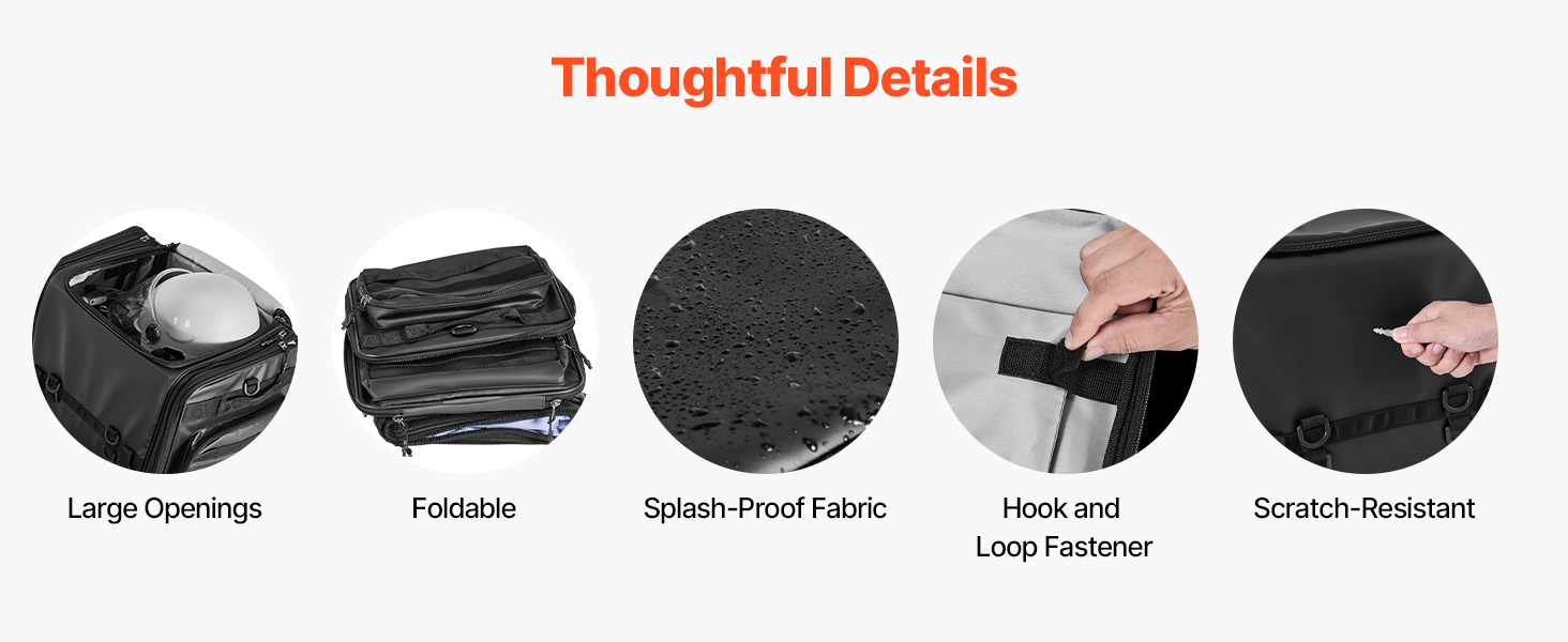 Vedenpitävä suojus ja roiskeita hylkivä, kulutusta kestävä kangas auttavat suojaamaan sisältöä sateelta ja tien roiskeilta. Sileä vetoketju on helppokäyttöinen myös käsineet kädessä, mikä parantaa käyttömukavuutta.