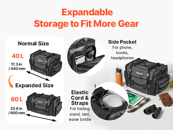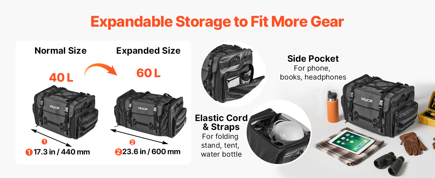 Moottoripyörän takalaukku 40–60 l laajennettava vedenpitävällä sadesuojalla, olkahihnat, musta
