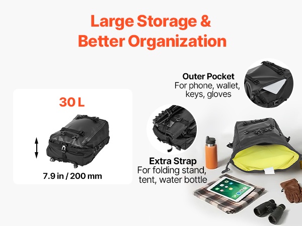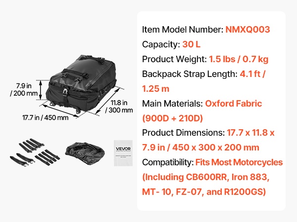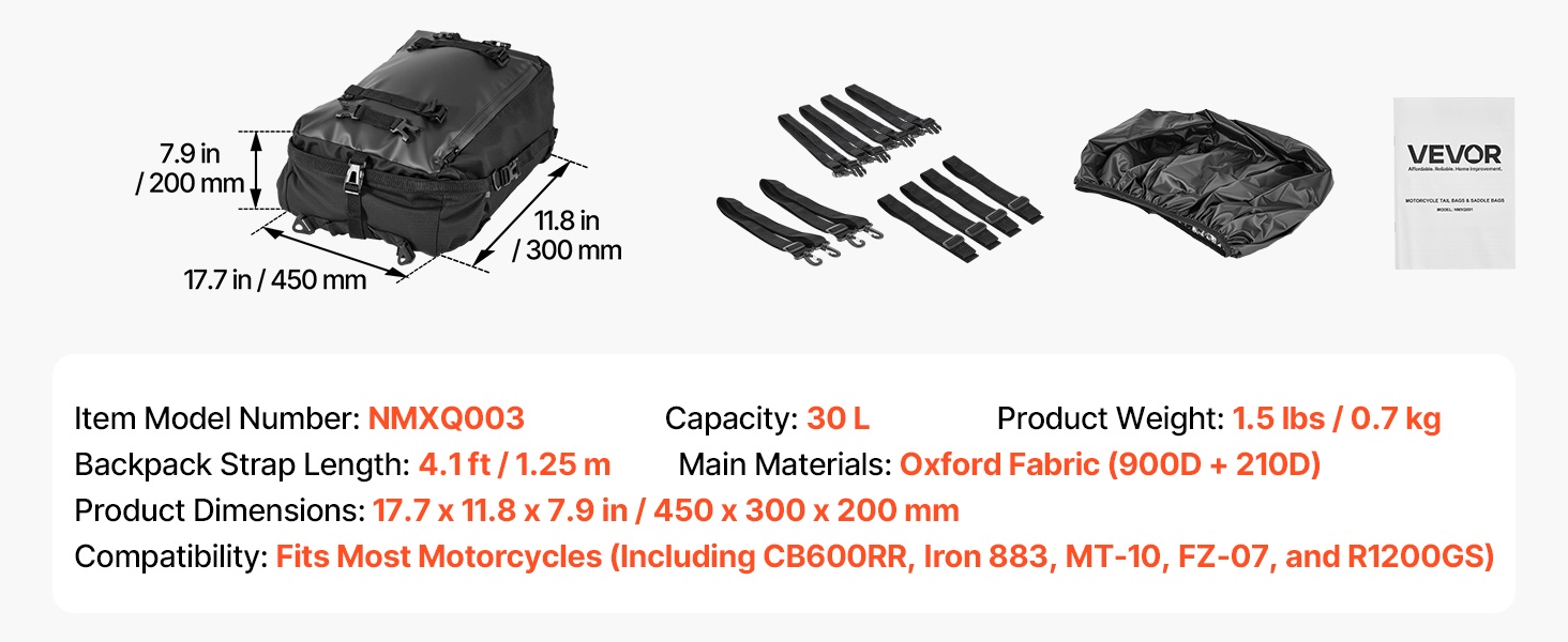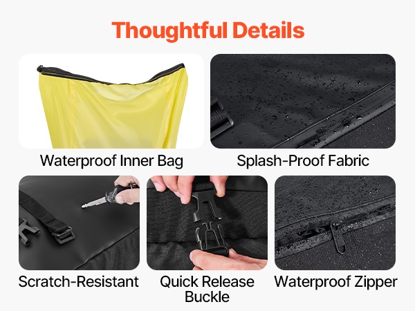 Vedenpitävä suojus ja roiskeita hylkivä, kulutusta kestävä kangas auttavat suojaamaan sisältöä sateelta ja tien roiskeilta. Sileä vetoketju on helppokäyttöinen myös käsineet kädessä, mikä parantaa käyttömukavuutta.