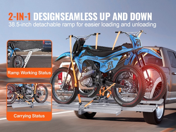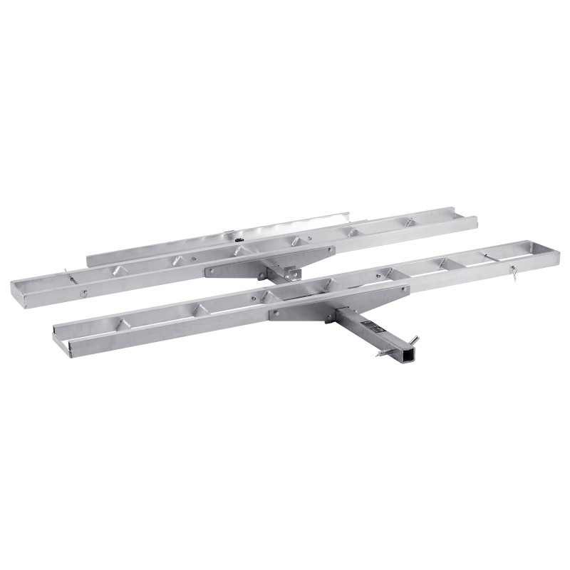 Moottoripyöräteline alumiininen kahdelle pyörälle kahden tuuman vetokoukun vastaanottimelle itsesäilyttävällä rampilla
