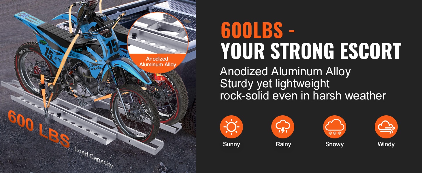 Vankka alumiinirunko ja huolellisesti suunniteltu rakenne auttavat pitämään moottoripyörät vakaasti paikoillaan kuljetuksen aikana. Teline soveltuu sekä raskaille moottoripyörille että kevyemmille malleille eri keliolosuhteissa.