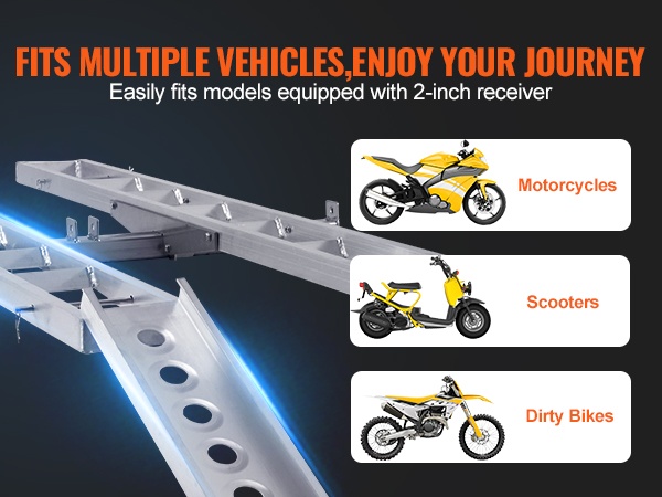Itsesäilyttävä ramppi helpottaa lastausta ja purkua, ja mukana tulevat kiristysliinat sekä stabilointiosat vähentävät heilumista ajon aikana. Teline sopii ajoneuvoihin, joissa on 2-tuumainen / 5.1 cm vetokoukun vastaanotin.