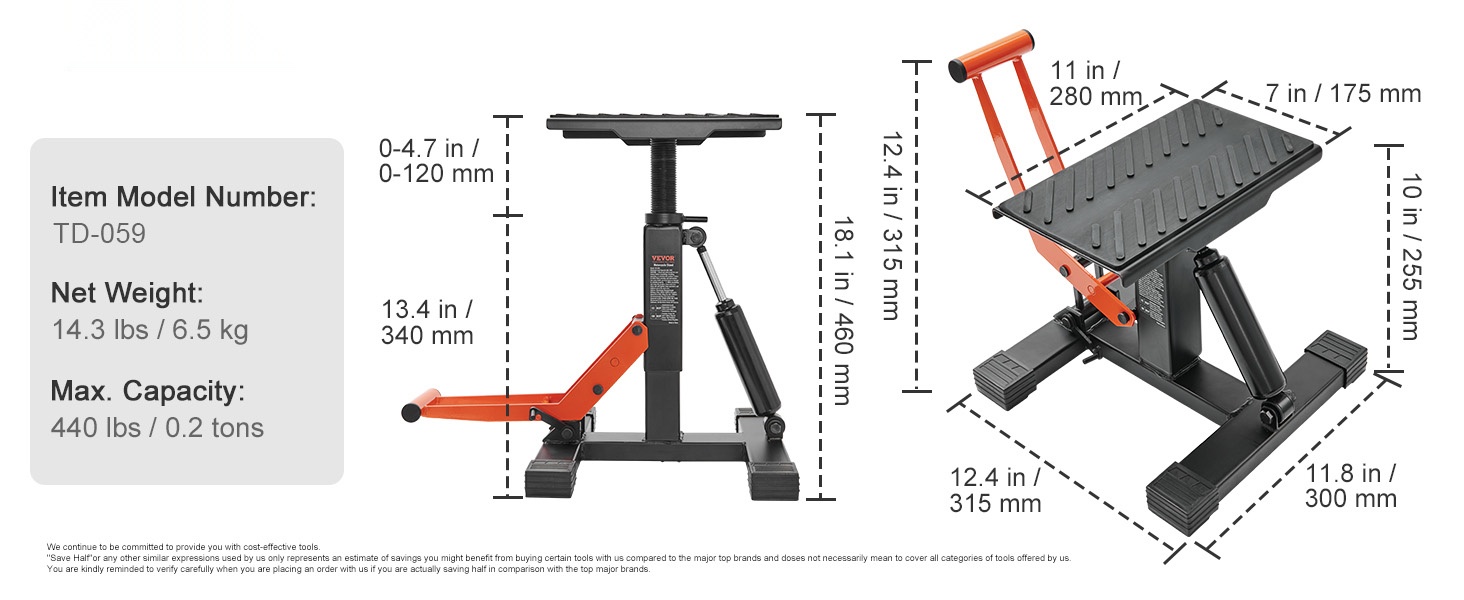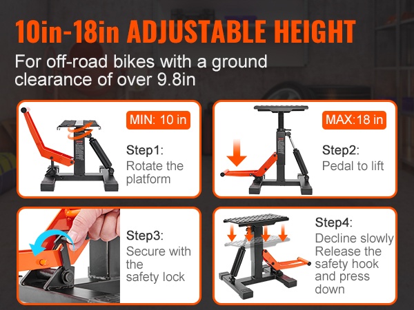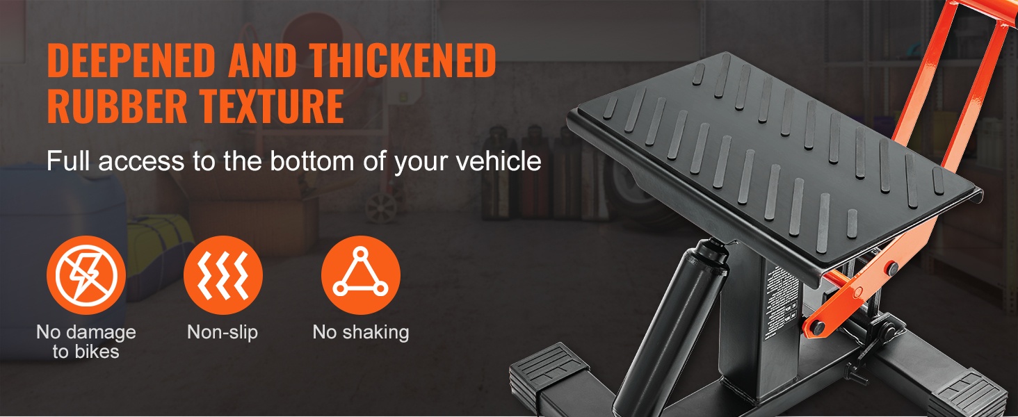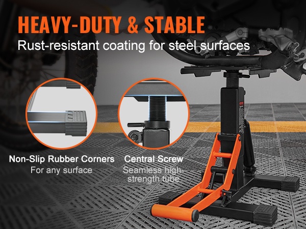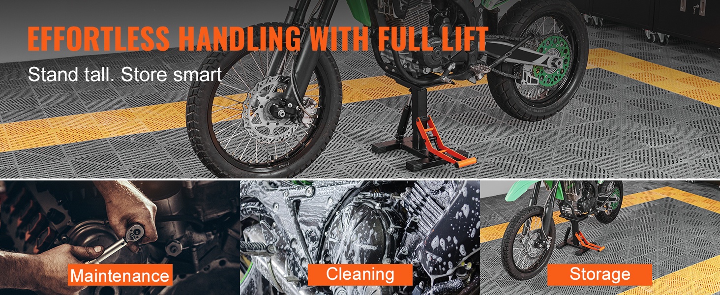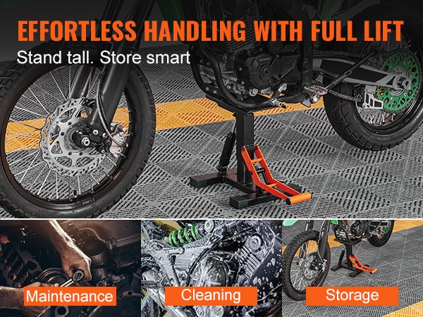 Ammattilaatuinen etu- ja takateline auttaa pitämään moottoripyöräsi tukevasti pystyssä huoltoa, pesua ja pitkäaikaista säilytystä varten. Yhdistelmämuotoilu nostaa sekä etu- että takapyörän, jolloin työskentely on helpompaa myös kotitallissa.