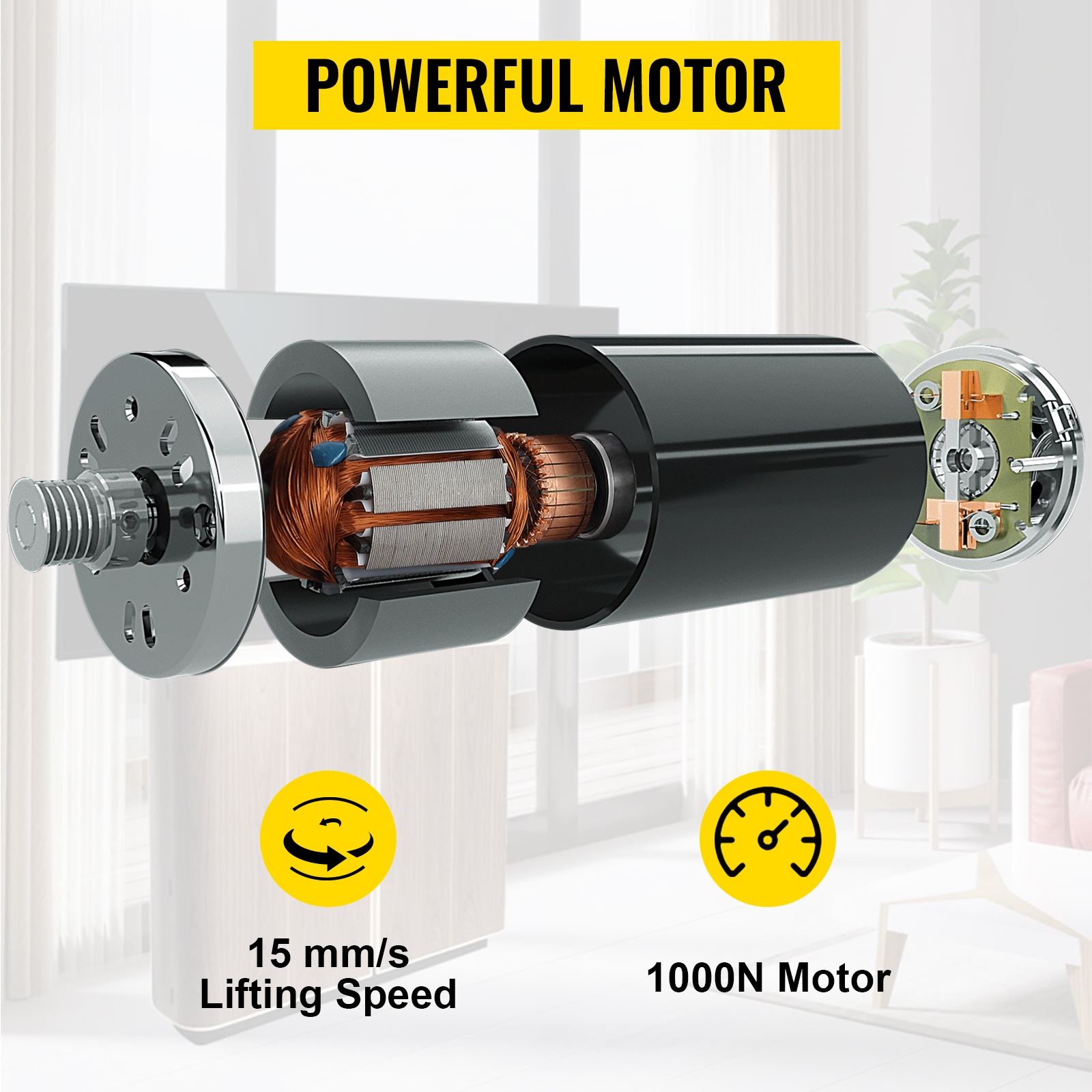 Nosto- ja laskuliikkeestä huolehtii 1000 N sähkömoottori, joka takaa tasaisen ja varman liikkeen koko säätöalueella.