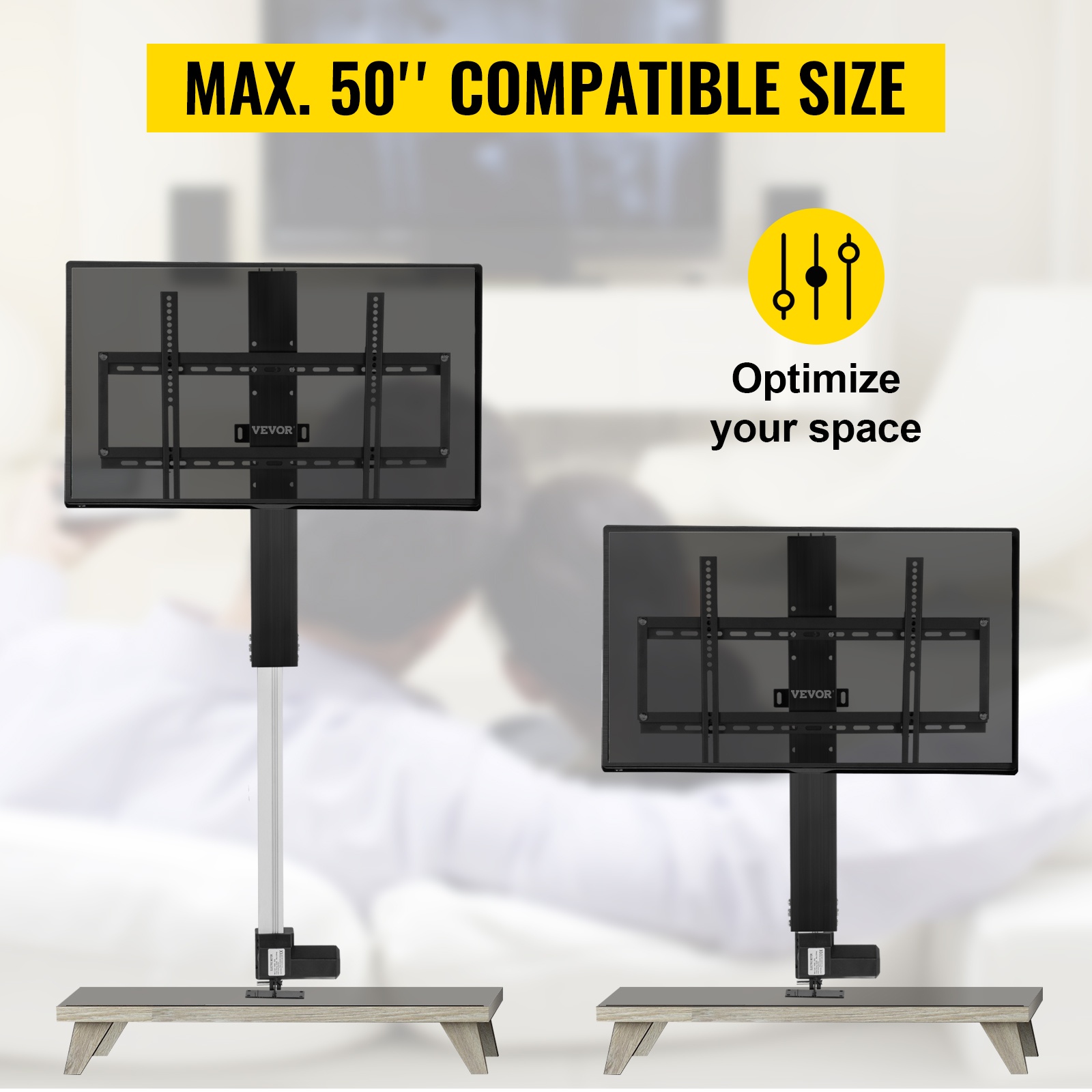 TV-nostin tarjoaa sähköisen korkeussäädön, jonka avulla näytön voi asettaa sopivaan katselukorkeuteen. Rakenne on suunniteltu yhteensopivaksi useiden TV-tyyppien, kuten LCD-, LED-, plasma- ja kaarevien televisioiden kanssa.