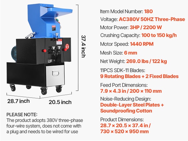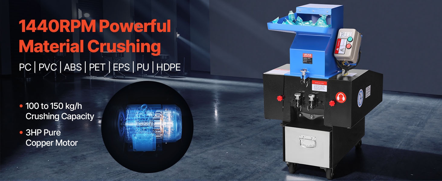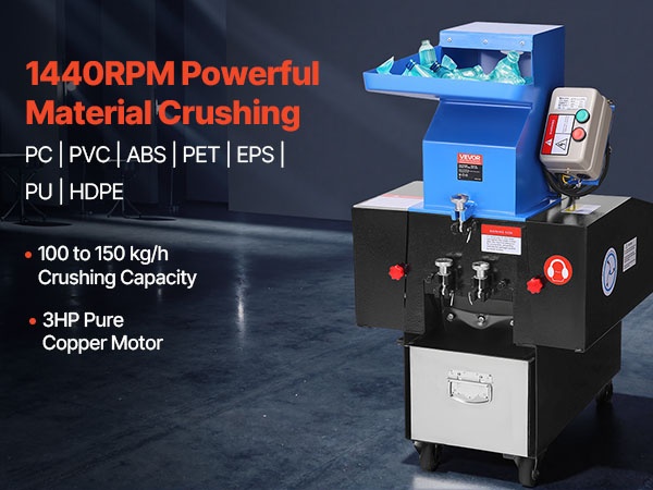 Tämä muovimurskain on varustettu 3HP puhtaalla kuparimoottorilla, joka tarjoaa 100–150 kg/h murskauskapasiteetin. Moottorin kierrosnopeus on 1440 RPM, se käyttää 6 mm seulaa ja SKD-11 -terää, ja se murskaa vaivattomasti laajan valikoiman materiaaleja, kuten PC, PVC, ABS, PET, EPS, PU, HDPE, kumia jne.