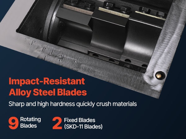 Muovimurskaimessa on 11 kpl SKD-11 -teriä (9 pyörivää + 2 kiinteää), jotka on valmistettu iskunkestävästä seosteräksestä. Terät ovat teräviä ja kovia, joten ne murskaavat tehokkaasti erilaisia materiaaleja. Terät voidaan teroittaa tai vaihtaa, mikä pidentää käyttöikää ja vähentää huoltokustannuksia.
