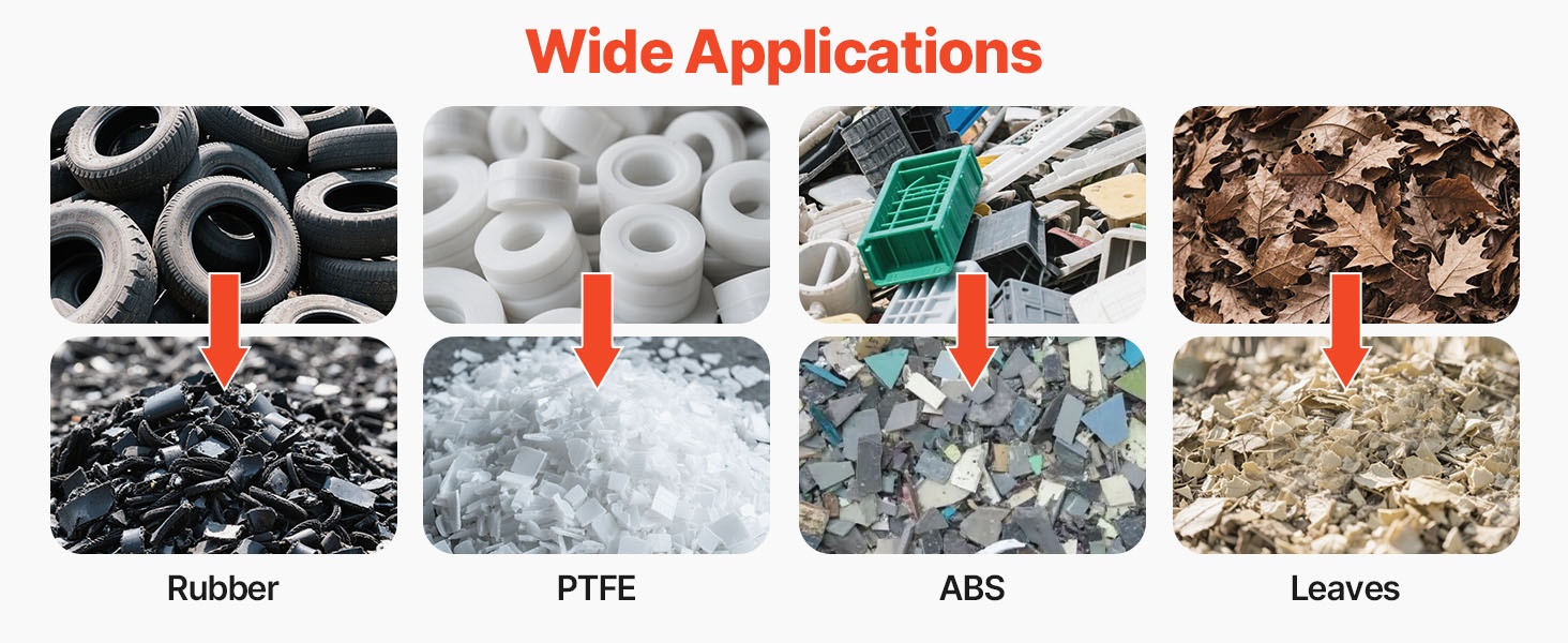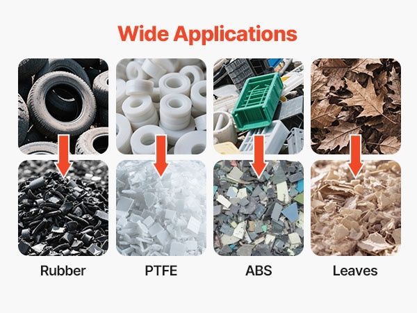 Murskain soveltuu monille materiaaleille, kuten ABS, PP, EVA, PC, PS, PVC, PU, PA, kumituotteet sekä lehdet, joten se täyttää monenlaiset kierrätys- ja murskaustarpeet.